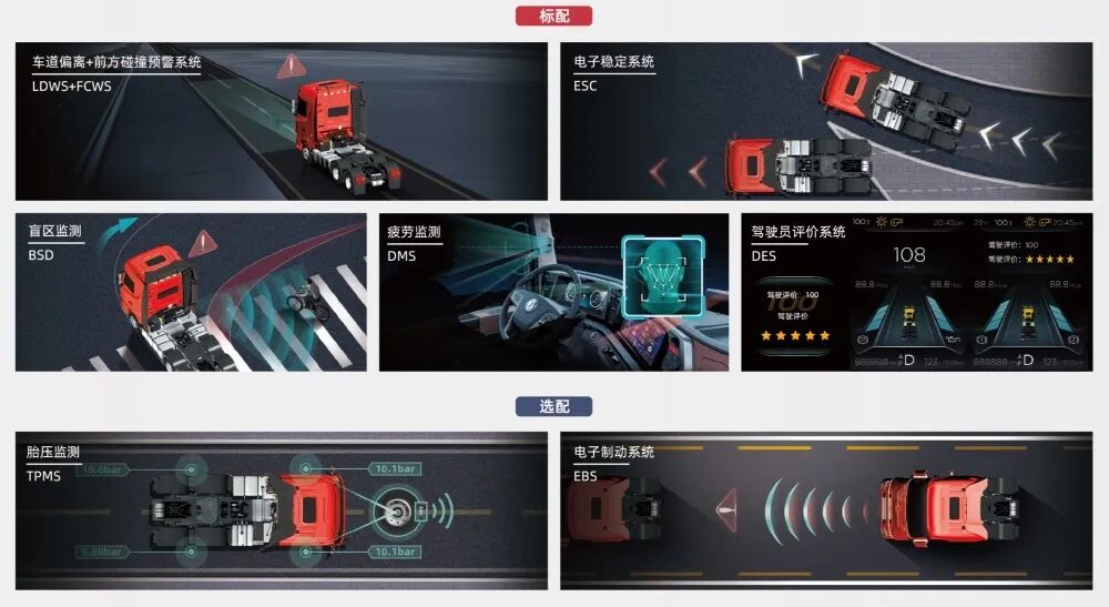 车辆可选全车盘式制动器、油箱防盗等,以硬核实力保障车辆安全。应用多项主动安全技术,集合AEBS自动紧急制动系统、LDWS车道偏离预警系统、FCWS前碰撞预警系统、360度环视影像、盲区监测系统、驾驶员疲劳监测系统、TPMS全车轮胎气压监测系统等,进一步提高行车安全系数。