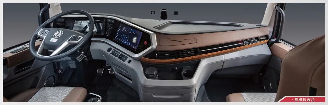 东风商用车致力于为车主营造温馨的家氛围,东风天龙KX王者版标配LED自动大灯,一键启动+无钥匙进入,伊思灵可调气囊座椅支持通风加热,12.3寸仪表+12.8寸娱乐屏,时尚科技感一览无遗;140mm全气囊驾驶室悬置,声学材料加强阻尼,抑制结构噪声和行驶风噪,达到国际高端重卡的静谧效果;240Ah蓄电池、发光保险丝、遮阳帘、大功率逆变器、小桌板等,美观又兼具耐用性。