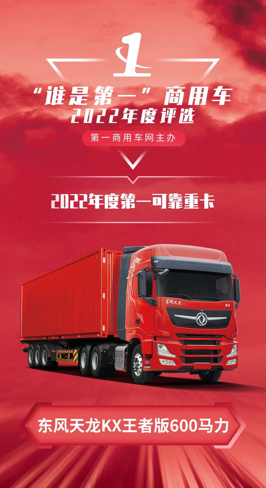 近日,在《第一商用车网》主办的“谁是第一” 商用车年度评选总决赛中, 东风天龙KX王者版600马力 凭借大马力、高经济性、高舒适及高可靠性,斩获“2022年度第一可靠重卡”大奖。