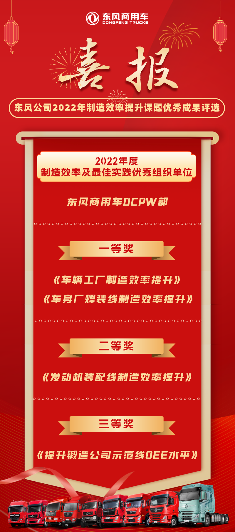 近日,东风汽车集团有限公司2022年制造效率提升课题优秀成果揭晓,两天时间15家事业单元,46项课题同台竞技,东风商用车有限公司选送的四项改善课题斩获佳绩,获得一等奖2项、二等奖1项、三等奖1项。同时,东风商用车DCPW部被评为2022年度“制造效率及最佳实践优秀组织单位”,标志着东风商用车在全面践行DCPW、助力品牌向上战略落地、推动公司高质量发展及提速等方面取得显著成效。