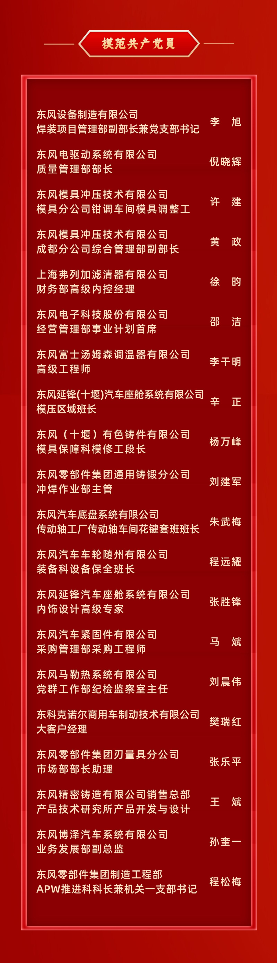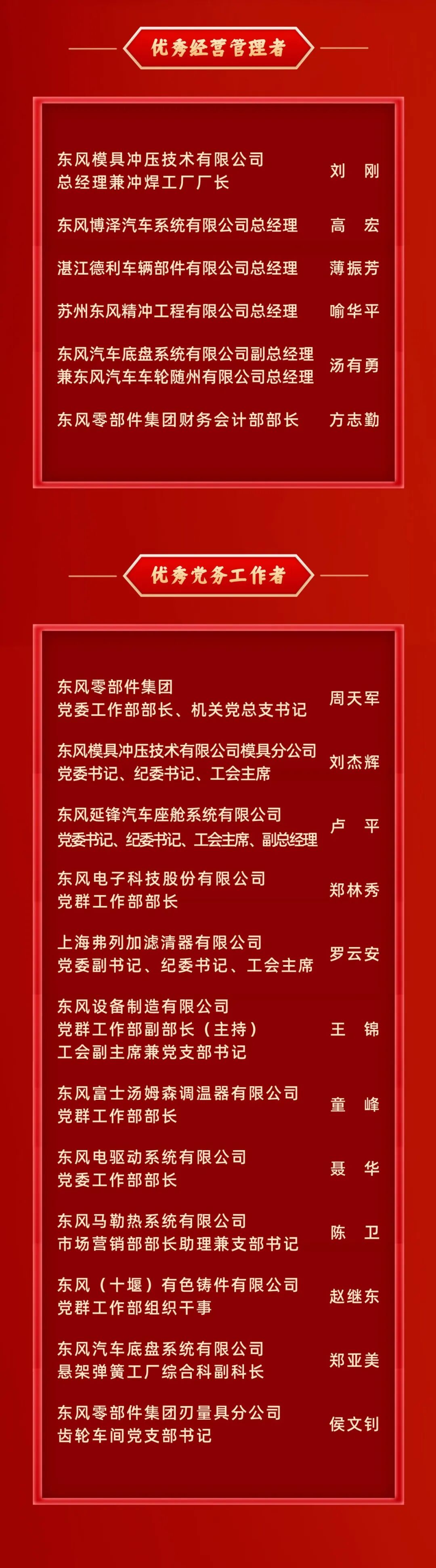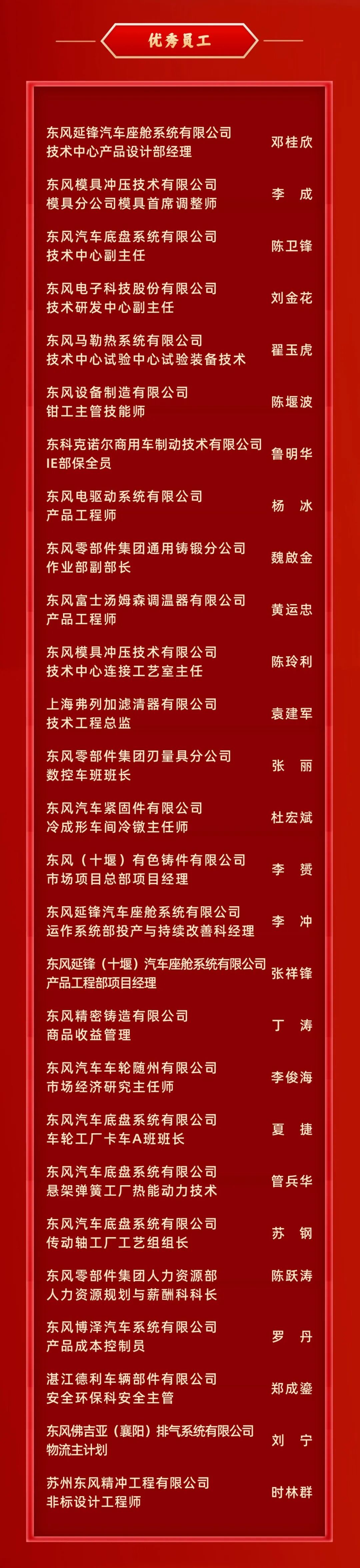 东风汽车有限公司副总裁、东风汽车零部件(集团)有限公司董事长、总经理陈兴林,东风零部件集团党委书记、工会主席蔡士龙,东风零部件集团党委副书记韩力,东风零部件集团副总经理叶征吾、罗耀华,东风零部件集团纪委书记张名荣等出席会议。