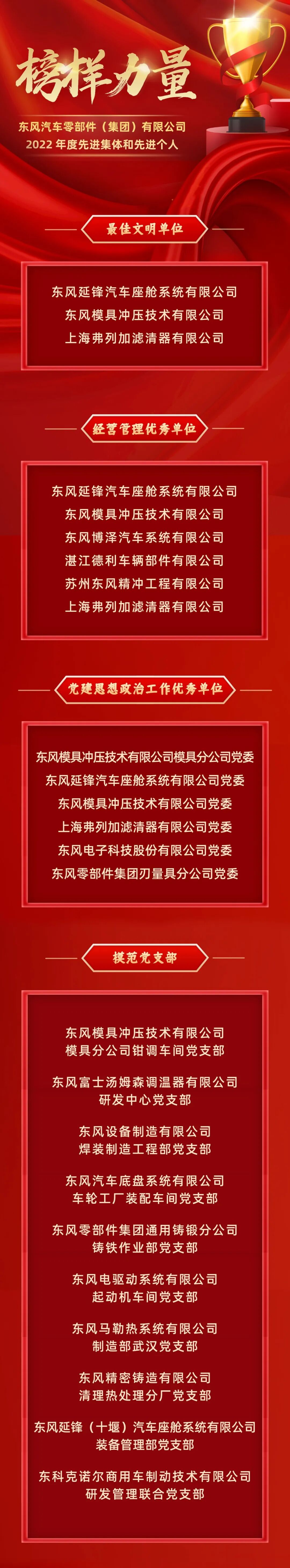 1月16日,东风汽车零部件(集团)有限公司召开2022年度表彰大会。大会以“微光成炬 逐光前行”为主题,表彰过去一年工作中涌现出的先进集体和个人。会议号召,东风零部件集团全体干部员工奋力开启新征程、再造新优势、实现新梦想,以最饱满的热情和最昂扬的斗志全力以赴、 大步向前!