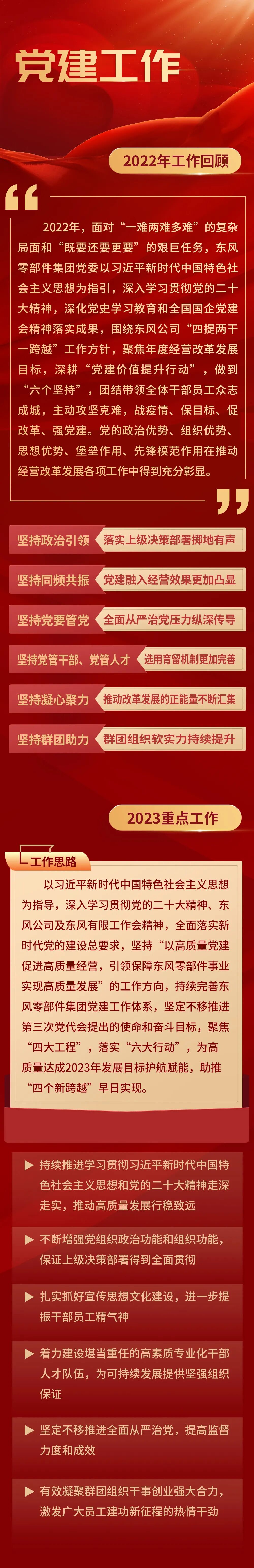 蔡士龙说,2023年是全面贯彻落实党的二十大精神、东风零部件集团第三次党代会精神的开局之年,也是深入实施“十四五”规划承前启后的关键之年。2023年目标任务繁重艰巨,经营形势严峻复杂,希望东风零部件集团各级党组织和广大党员干部要以“时时放心不下”的责任感和守土有责、守土负责、守土尽责的态度绷紧责任之弦,站在时代潮流最前列、站在攻坚克难最前沿、站在广大员工最前排,坚决扛起推动东风零部件集团事业发展的责任担当。