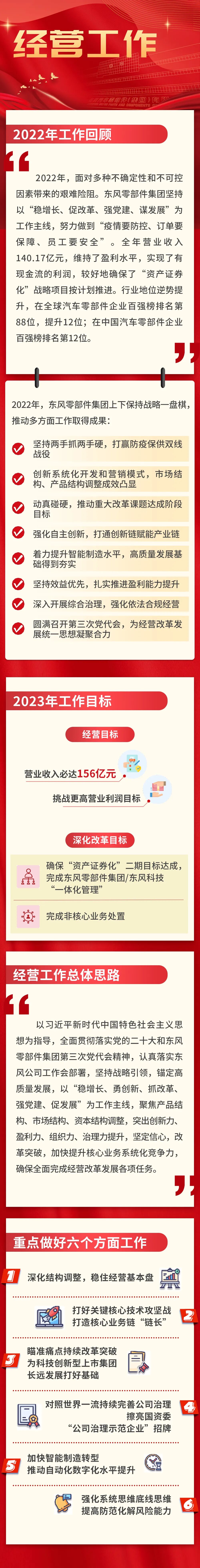 陈昊要求,2023年东风零部件集团要加快创新突破,为东风“科技跃迁”而担当;加速产品结构调整,实现结构件向功能件转型,乘商并举,不断强化东风内外体系双循环;要坚定信心,全面达成2023年经营改革目标;要坚持和加强党的全面领导,认真贯彻民主集中制,坚持用党的理论统一思想、统一意志、统一行动,以高质量党建引领高质量发展。