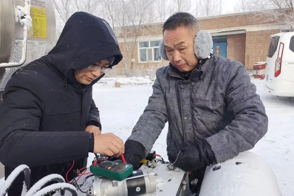 ▲1月25日,东风电驱动起动机设计杨俊保、试验员陈刚、市场客户经理廖红梅赶往内蒙古呼伦贝尔寒区,在-20℃的寒风中完成起动机冷启动试验