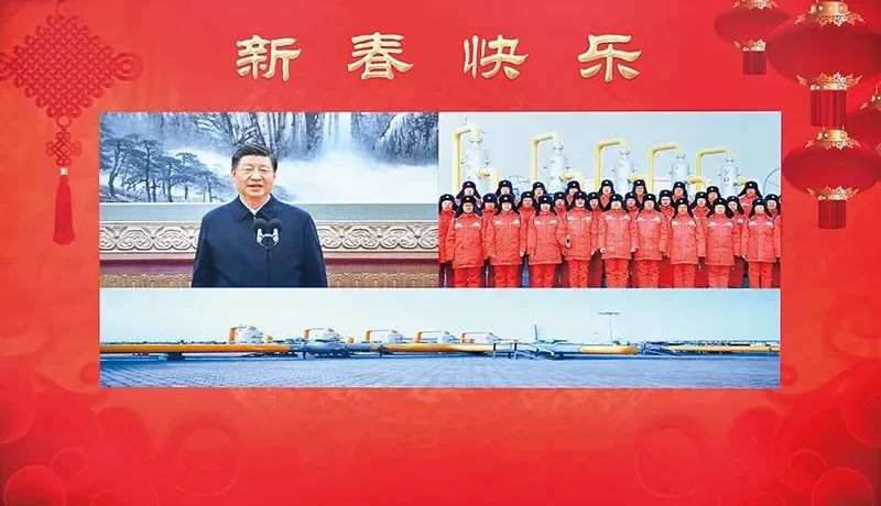 2023年1月18日,中共中央总书记、国家主席、中央军委主席习近平在北京通过视频连线看望慰问基层干部群众,向全国各族人民致以新春的美好祝福。这是习近平通过视频连线,同塔里木油田公司轮南油气储运中心西气东输第一站克拉集气区员工亲切交流。 新华社记者 李涛/摄