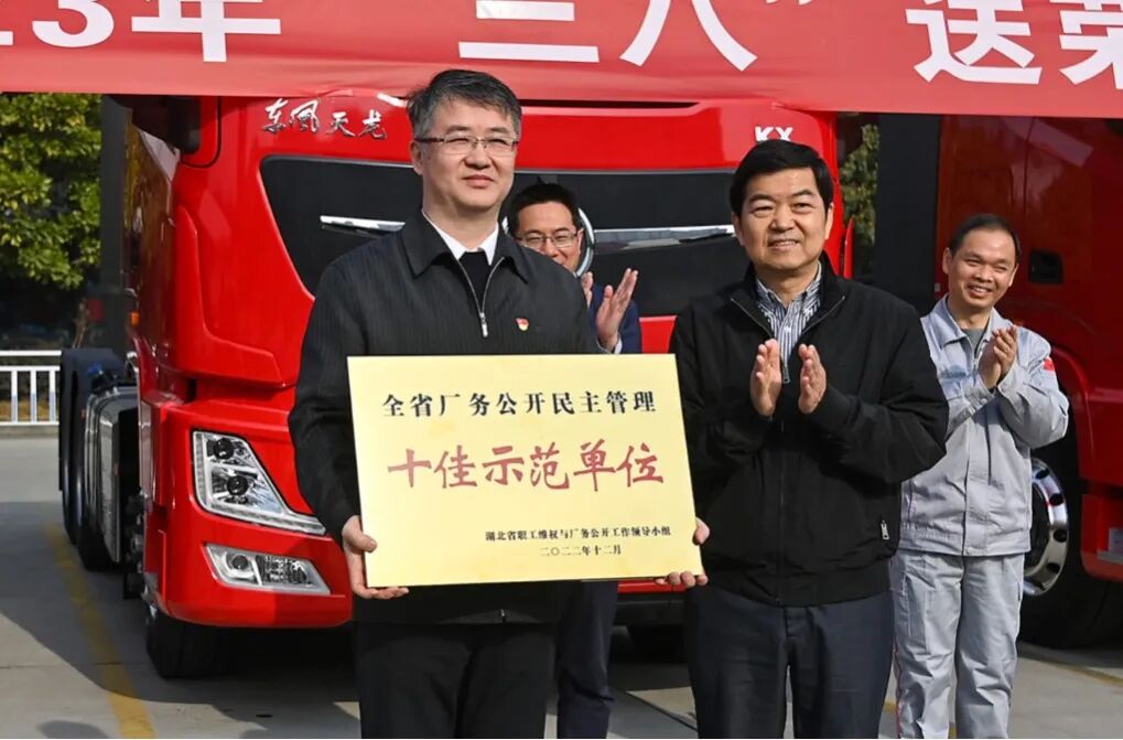 何伟为东风商用车颁发“湖北省厂务公开民主管理十佳示范单位”奖牌,为东风商用车技术中心“巾帼文芳创新工作室”授牌,为车辆工厂工会女职工委员会、车身厂工会女职工委员会颁发东风公司2022年度“模范工会女职工委员会”奖牌