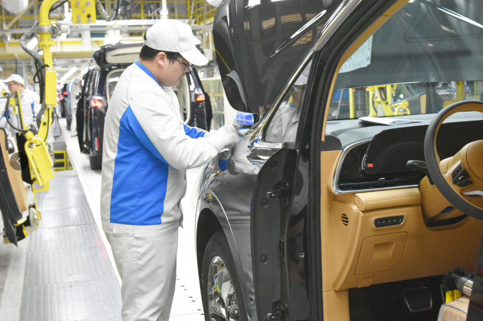 ▲岚图汽车总装工厂生产线上的员工都在紧张有序地忙碌,精益求精生产好每一辆车。