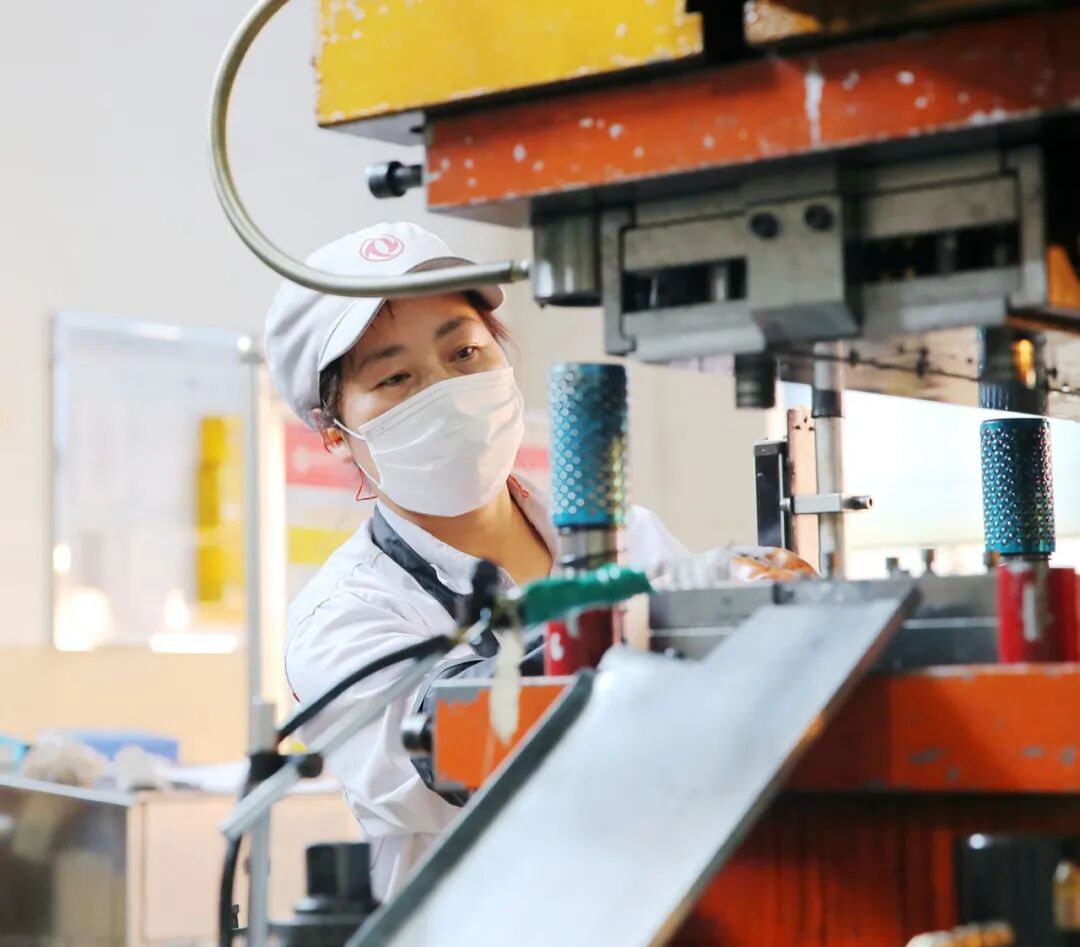 从3月份工厂复工以来,连续模班“碗型塞”生产阵地采取9对9小时的倒班,7台连续模冲压设备全部开动,每天班产21万件零件。