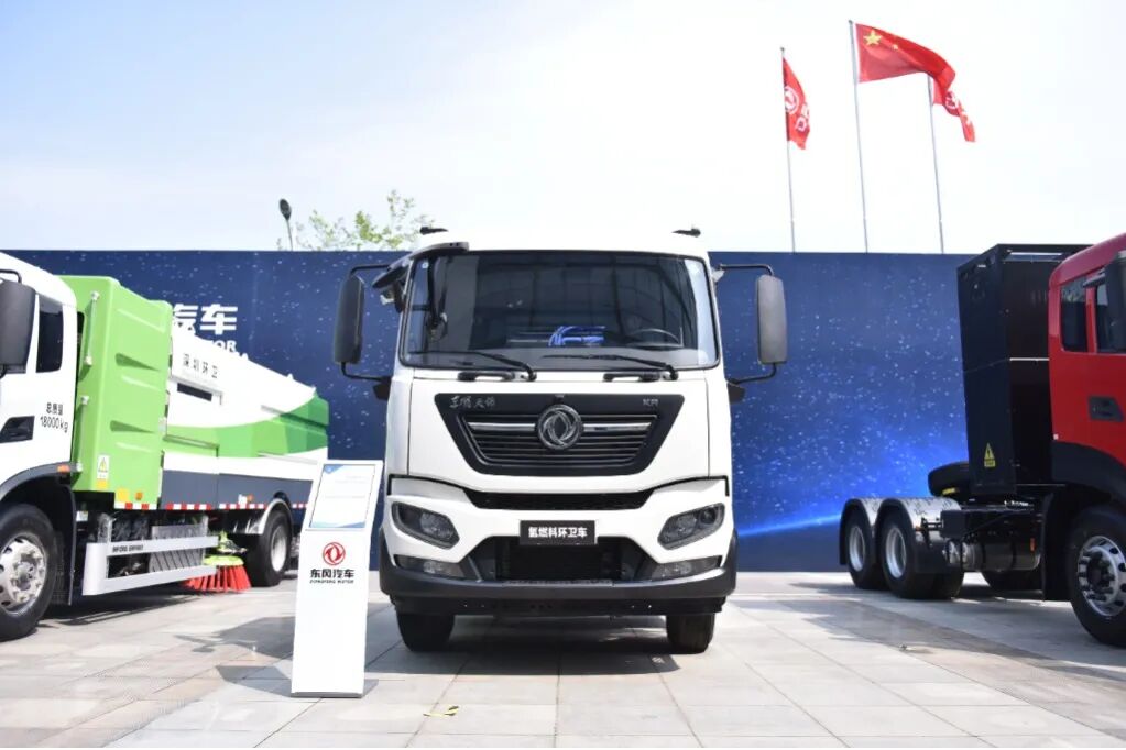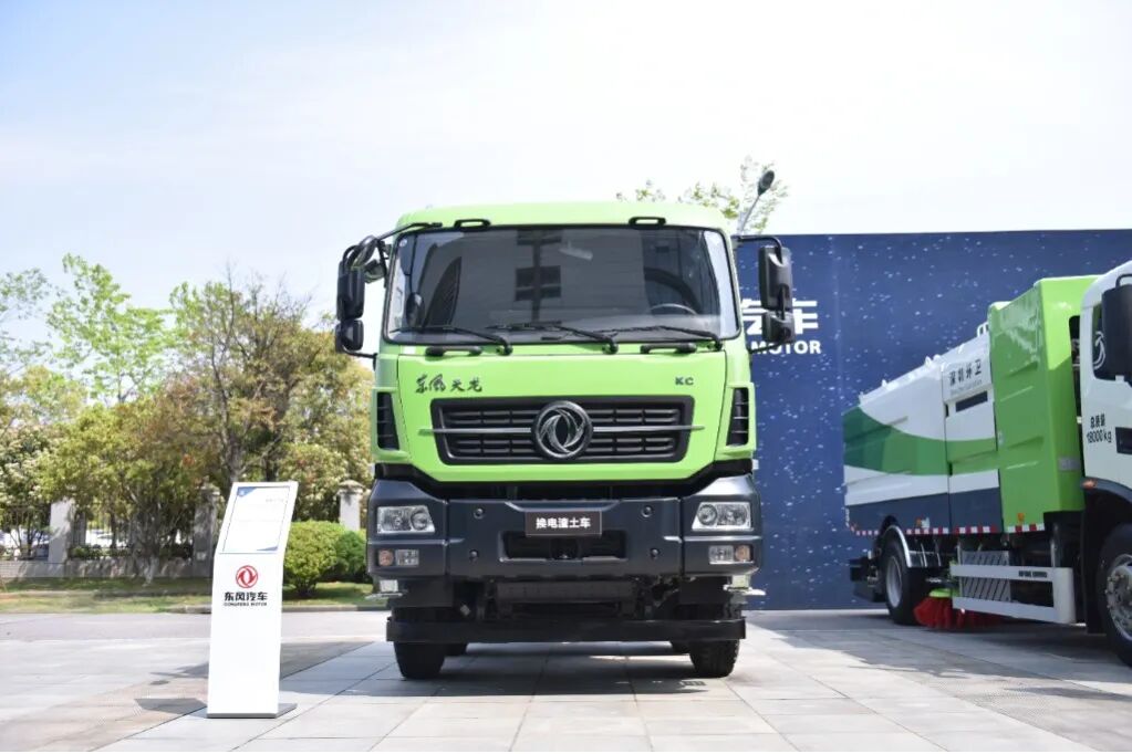 东风商用车带来4款新能源中重卡——东风天锦KR纯电环卫车、东风天锦KR氢燃料环卫车、东风天龙KC换电渣土车、东风天龙KL换电牵引车,集中展示了加快低碳转型升级道路上的丰硕成果。