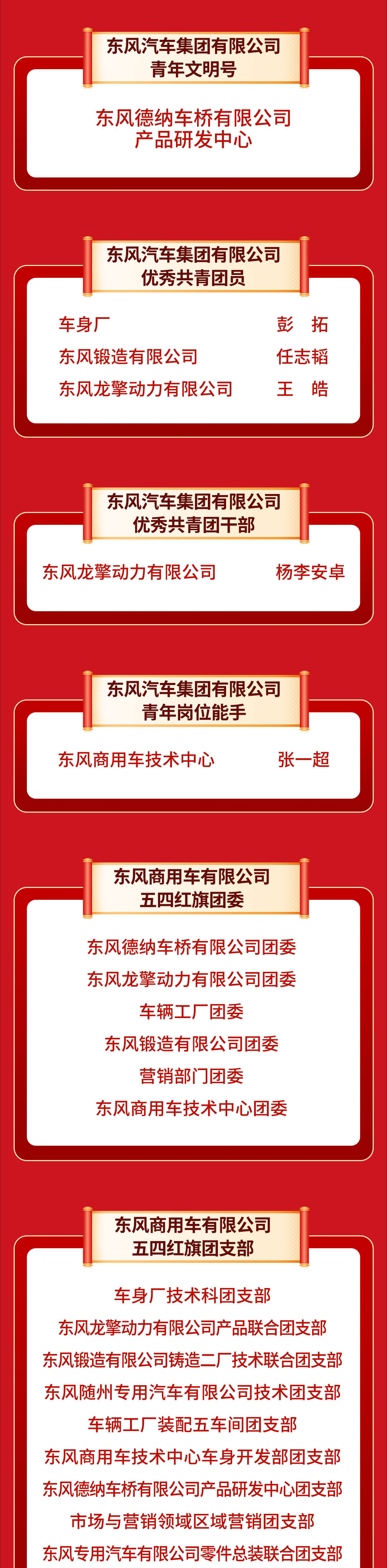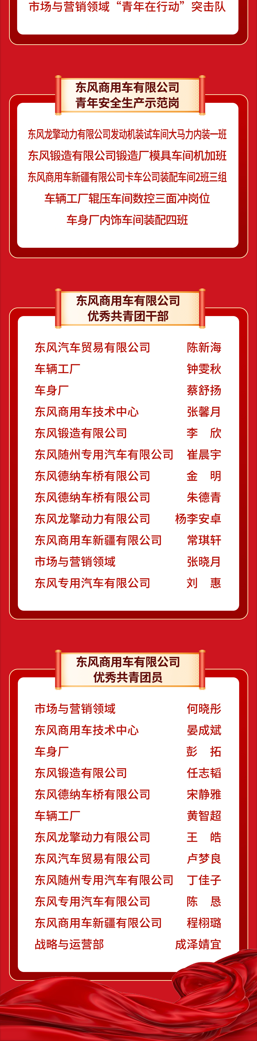 东风公司团委副书记张永星、团委青年发展部部长陈子默,东风商用车党委副书记、工会主席陈向阳,全国人大代表、全国劳动模范、车辆工厂首席技能师王建清,东风商用车相关职能部门负责人、相关单位党委书记、团委书记以及团员青年代表参加会议。东风商用车团委书记童代立宣读表彰决定。