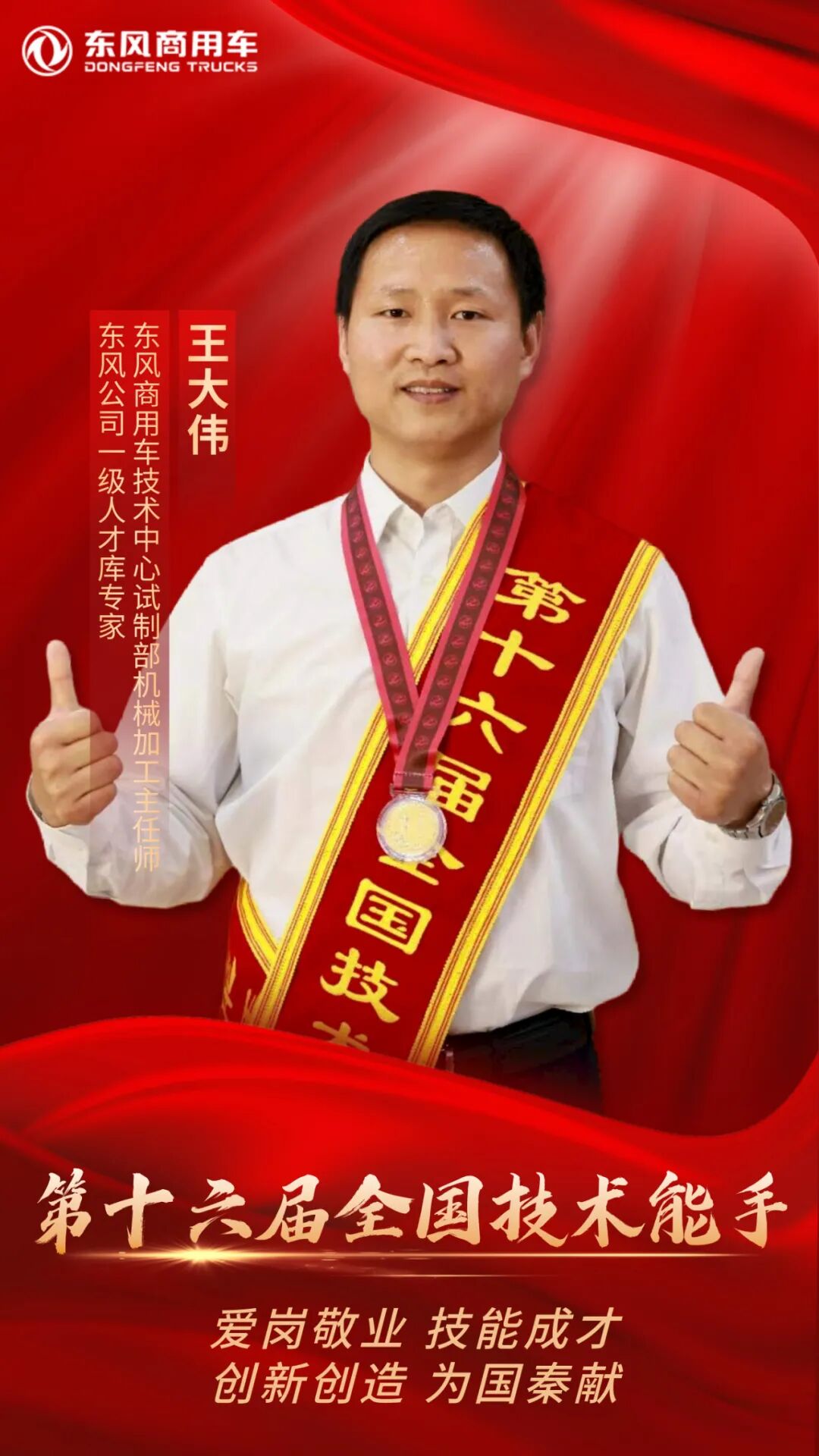 王大伟,东风商用车技术中心试制部机械加工主任师,东风公司一级人才库专家。曾获全国青年岗位能手、湖北省青年职业技能大赛冠军、湖北省技术能手、湖北省五四青年奖章等荣誉,所带领的班组也多次获得各项荣誉。