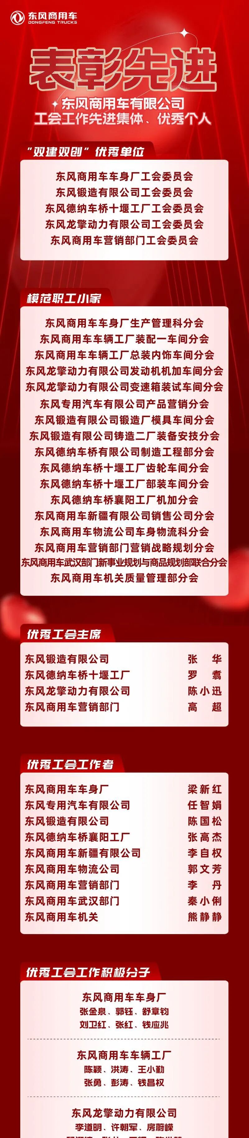 东风商用车党委副书记、工会主席陈向阳,先后来到物流公司、东风新疆、车身厂、东风龙擎、东风专汽、车辆工厂、东风德纳车桥十堰工厂、东风锻造、市场与营销领域、东风汽贸,为获得“双建双创”优秀单位、模范职工小家、优秀工会主席、优秀工会工作者、优秀工会工作积极分子、服务职工优秀创新项目、工人先锋号等荣誉的先进集体和个人颁奖。