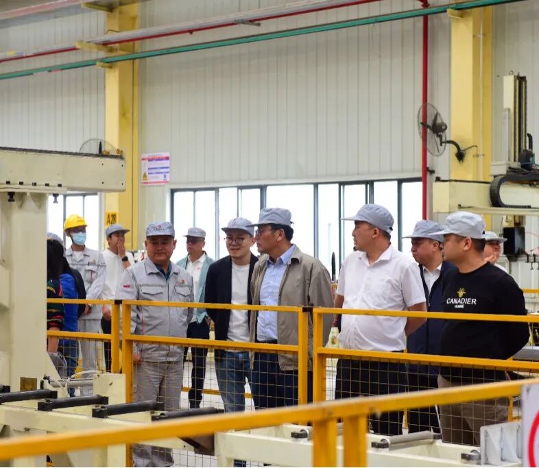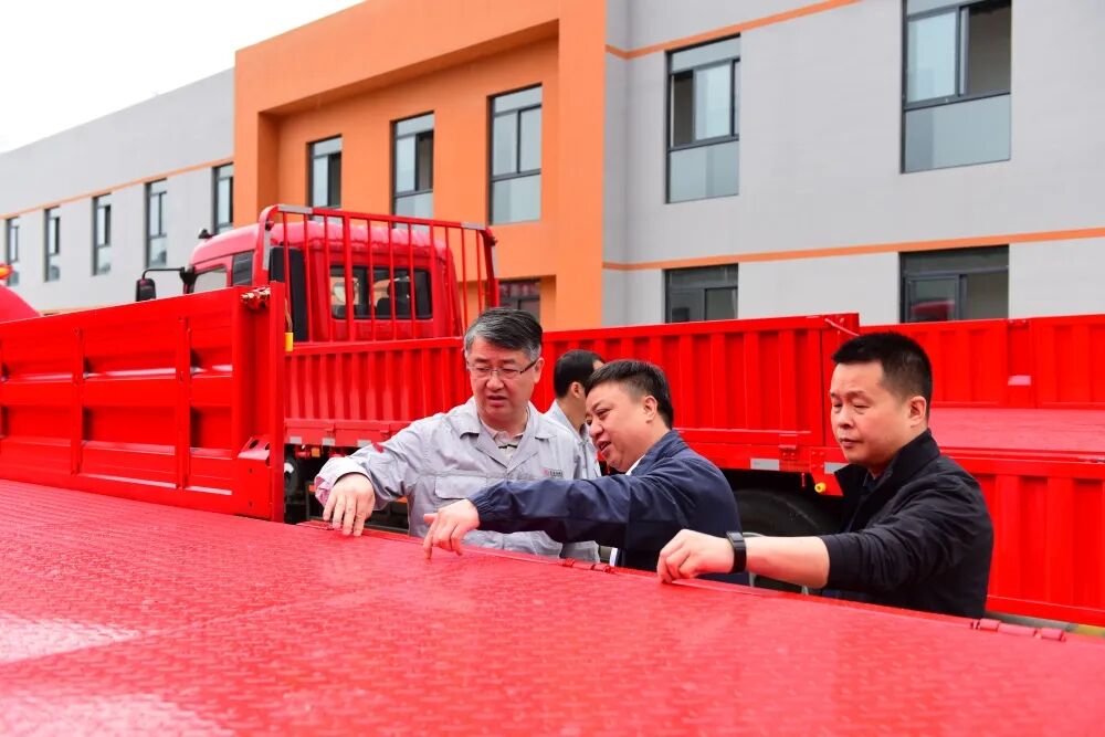▋ 东风商用车党委副书记、工会主席陈向阳(左一)在开展“双建双创”2023年工会表彰送奖到现场活动时,也来到展示现场,详细询问了产品特性与卖点优势