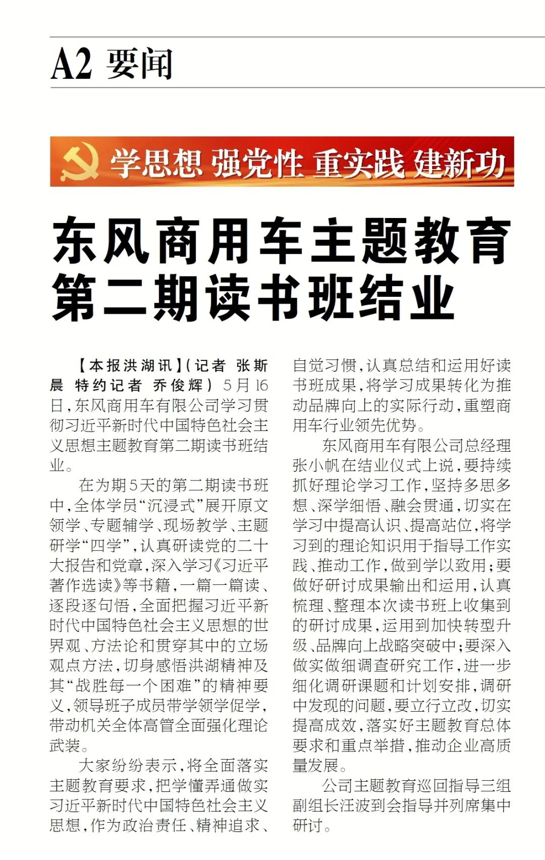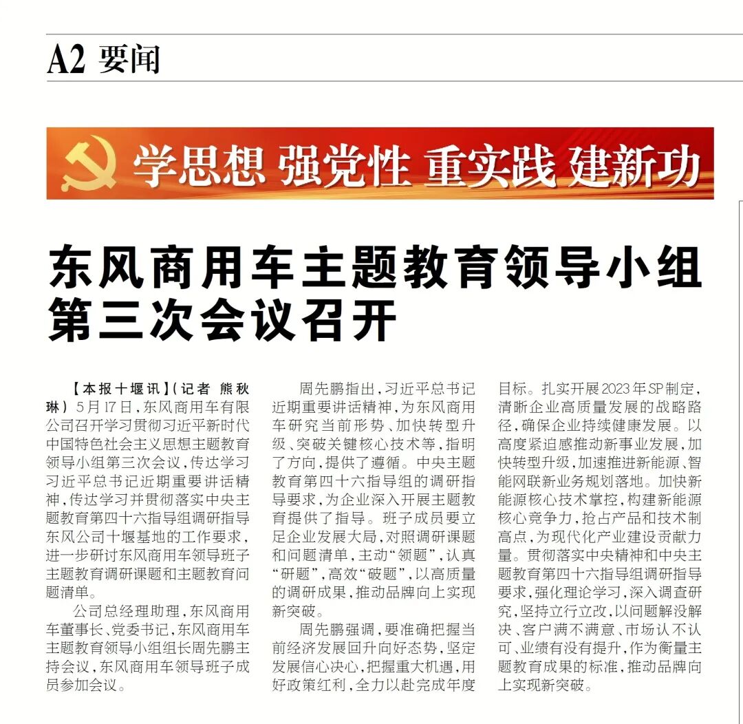 主题教育开展以来,东风商用车通过微信公众号、官网、《东风汽车报》、东风TV、厂区电子屏等平台加强主题教育进展情况宣传,2个月内刊(播)发主题教育相关信息24篇,在东风公司学习主题教育官网发布4篇。