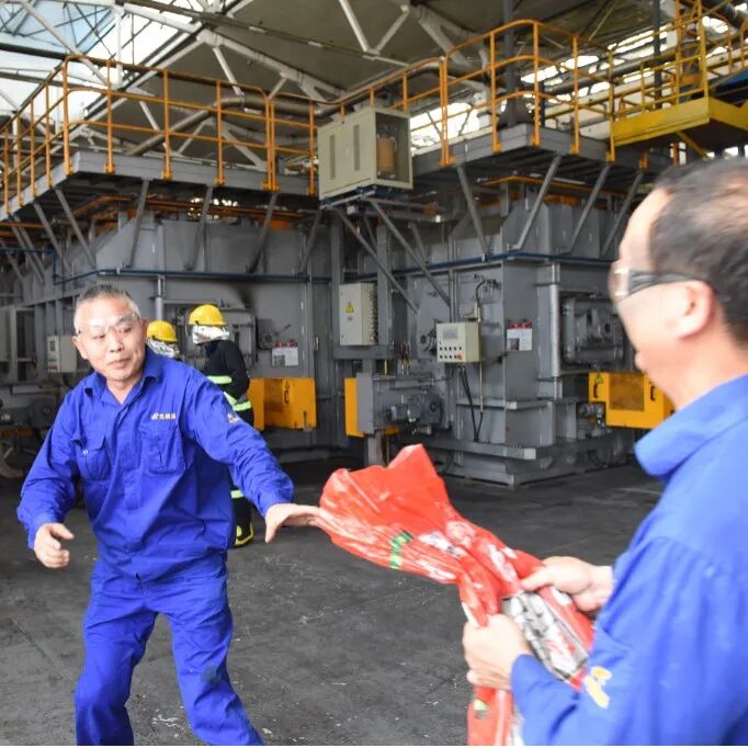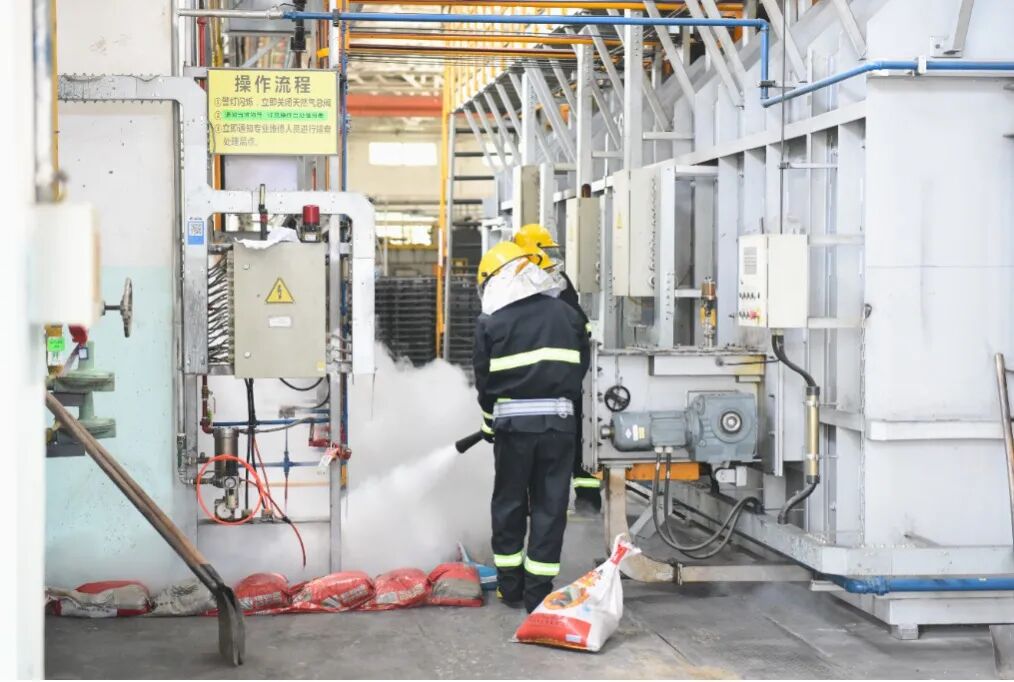 本次应急演练模拟工厂热处理车间9号炉流量架甲醇阀门处滴漏,当班监控人员听到报警声后迅速到现场巡视,并立即报告当班班长。班长到现场查看后,立即采取措施,并向车间领导报告,迅速关闭9号炉天然气、甲醇总阀门,加大各区氮气量,设备停止运行。