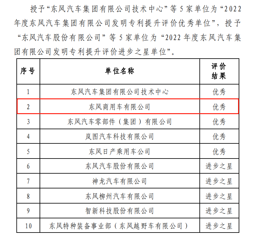 近日,东风公司公布了2022年度发明专利提升工作评价结果,东风商用车有限公司再获“优秀单位”。