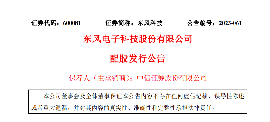 7月27日,东风电子科技股份有限公司召开第八届董事会2023年第七次临时会议,审议通过配股价格为9.59元/股,配股以本次发行股权登记日2023年8月1日(T日)上交所收市后的发行人总股本447,276,315股为基数,按照每10股配售3股的比例向全体股东配售,可配售股份总额为134,182,894股,均为无限售条件流通股。公司现有总股本447,276,315股,全部有权参与本次配股发行。