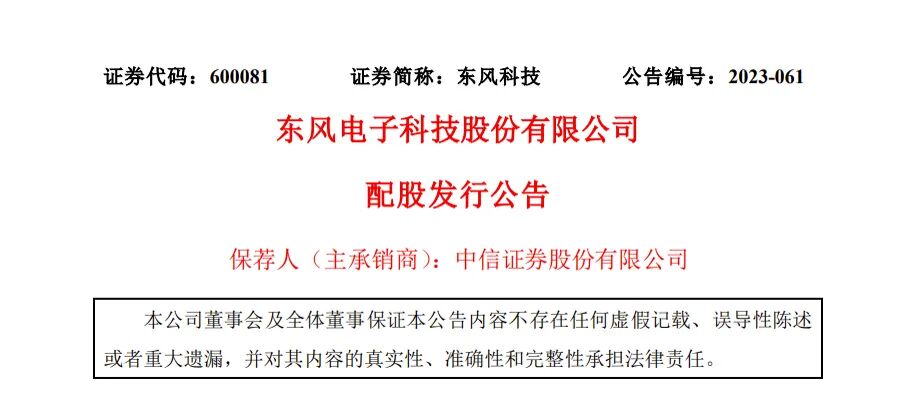 【东风汽车报大风口讯】 7月27日,东风电子科技股份有限公司召开第八届董事会2023年第七次临时会议,审议通过配股价格为9.59元/股,配股以本次发行股权登记日2023年8月1日(T日)上交所收市后的发行人总股本447,276,315股为基数,按照每10股配售3股的比例向全体股东配售,可配售股份总额为134,182,894股,均为无限售条件流通股。该公司现有总股本447,276,315股,全部有权参与本次配股发行。