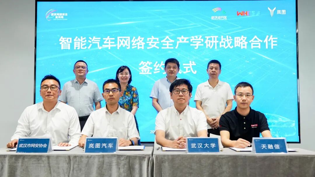 活动现场,岚图汽车与武汉大学国家网络安全学院、武汉市网络安全协会以及天融信科技集团签署了智能汽车网络安全产学研战略合作协议,四方将在联合研究、人才培养和市场推广等方面深度合作,共同推广智能汽车网络安全技术和解决方案,提升我国智能汽车产业的竞争力,共筑网络安全高地。