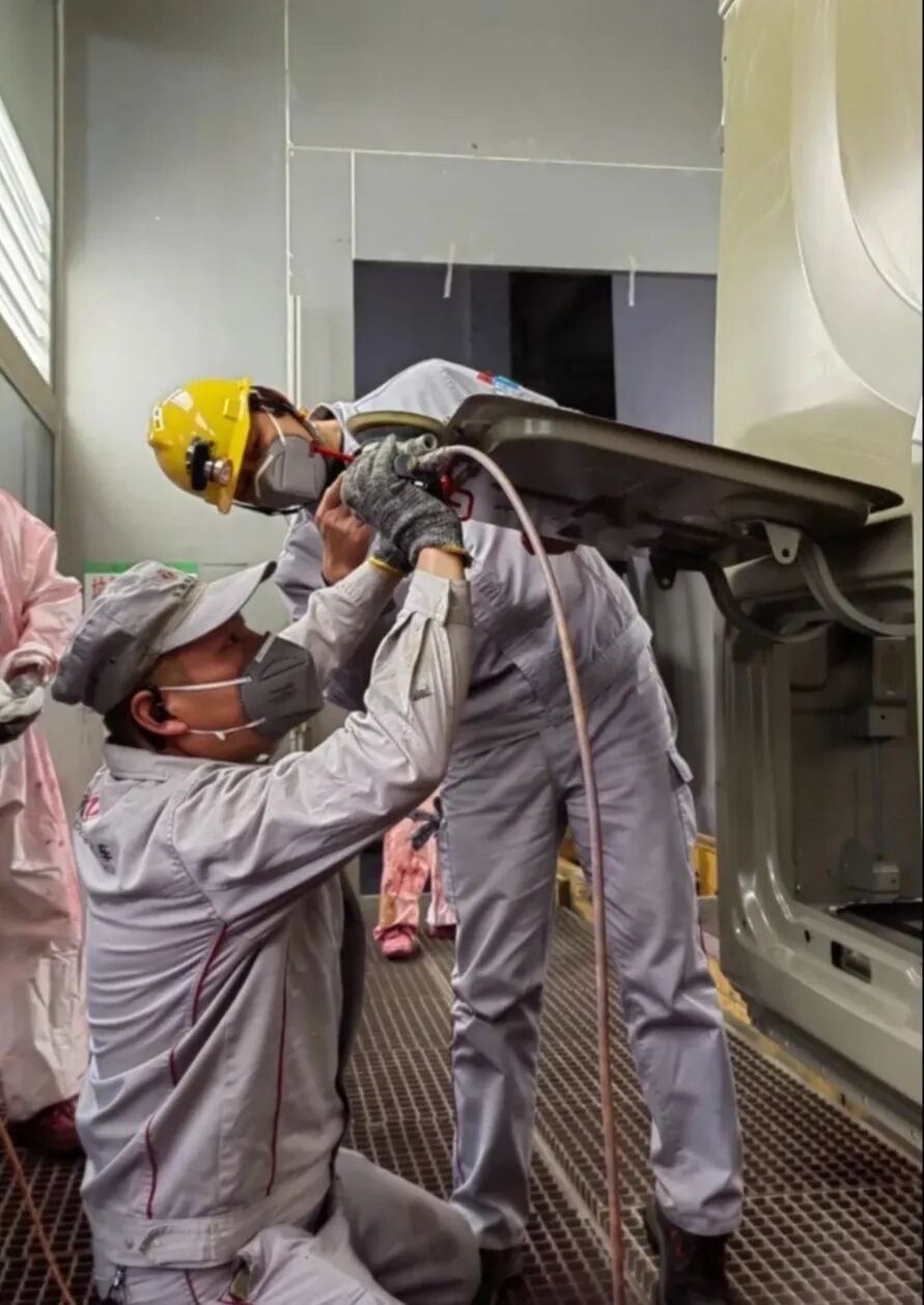 涂装车间针对海外客户提出的新需求——东风天龙KX“珠光白”配色,优化喷涂工艺、做好生产组织、调动精兵强将。为保证新配色质量,员工们精心操作、精细核算、精准喷涂,多点发力保证制程质量。