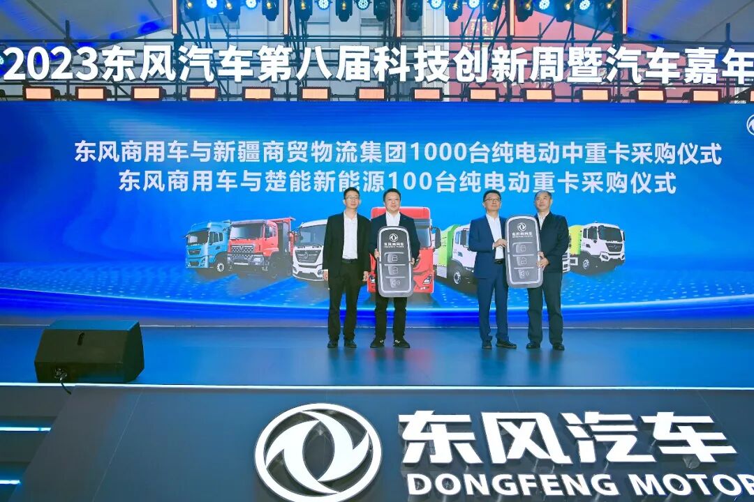 新疆商贸物流(集团)有限公司向东风商用车采购1000辆纯电动中重卡,楚能新能源股份有限公司向东风商用车采购100辆纯电动重卡,东风商用车凭借卓越的产品实力,赋能美好汽车生活,获得客户信赖与市场认可。