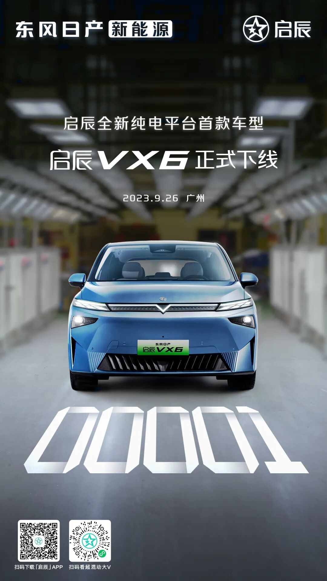 【东风汽车报大风口广州讯】 9月26日,东风日产启辰全新纯电平台首款车型——启辰VX6在广州花都工厂下线。这是启辰新能源战略下,以新平台、新设计打造的全新纯电动SUV,也是启辰三条技术路径下纯电技术路径的落地产品,预计将在10月与消费者正式见面。