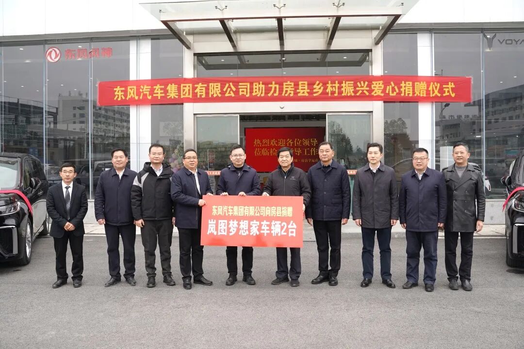 【东风汽车报十堰讯】 1月5日,东风汽车集团有限公司助力房县乡村振兴爱心捐赠仪式在东风汽车商城房县亨运店举行。公司工会主席何伟代表东风公司向房县捐赠2辆岚图梦想家汽车,助力乡村振兴。房县县委副书记、代理县长杨丹华,房县县委常委、副县长黄克伟等出席捐赠仪式。