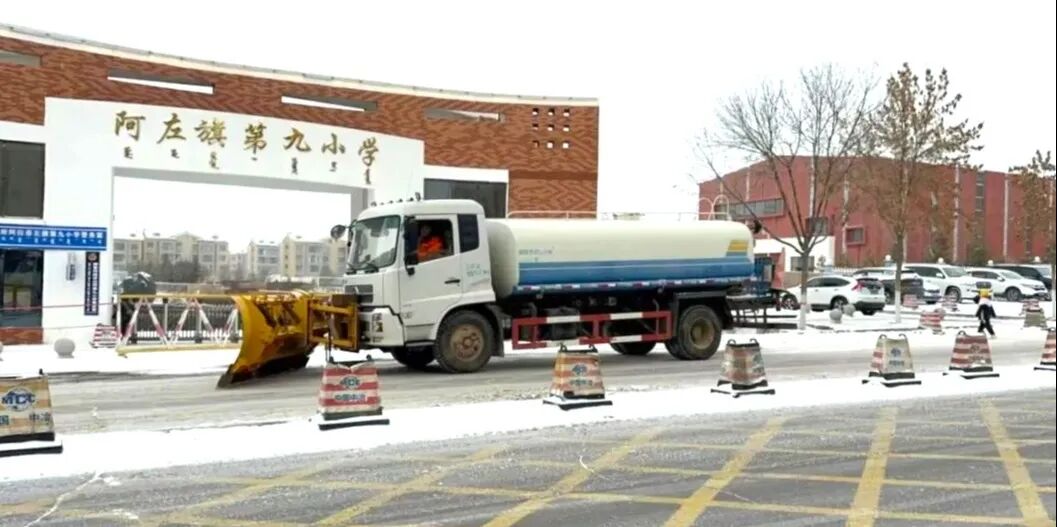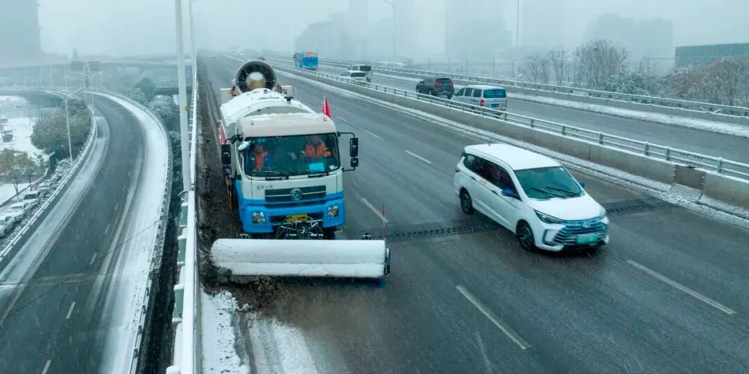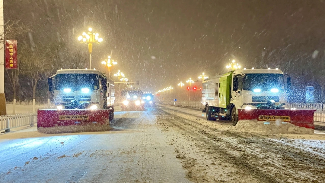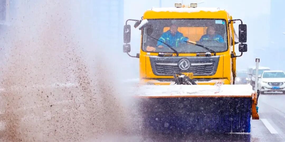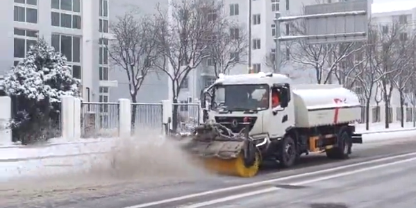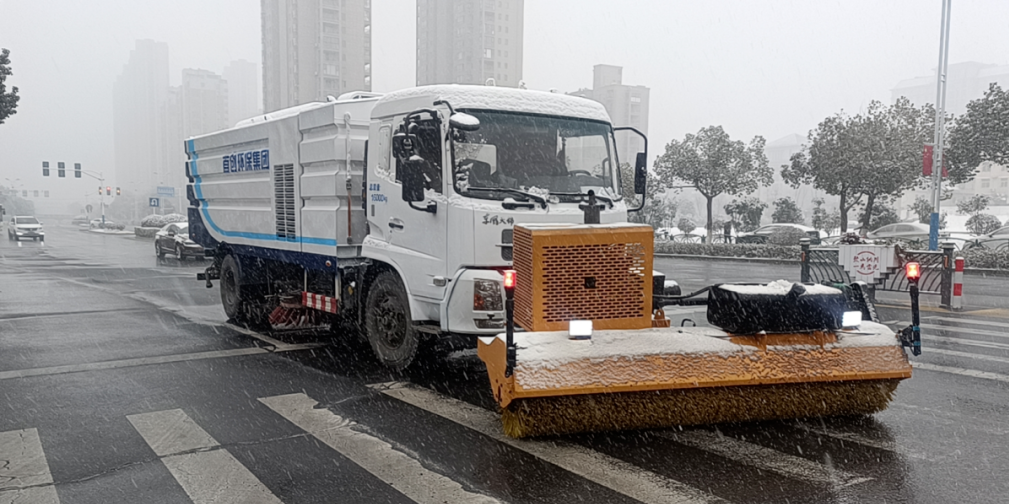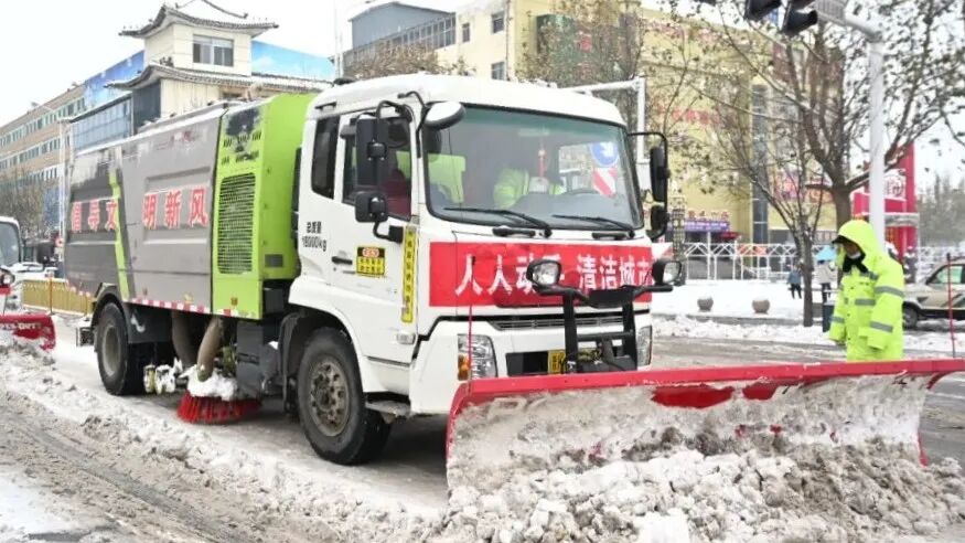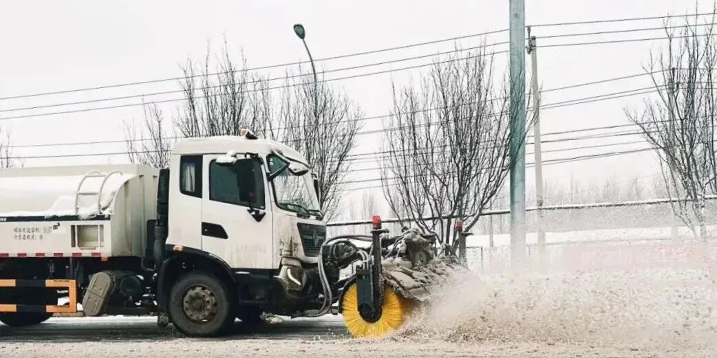 市政环卫部门组织东风天锦扫雪防冻一体车、扫雪滚刷车进行除雪作业,做到“即下即扫、雪停路清”。