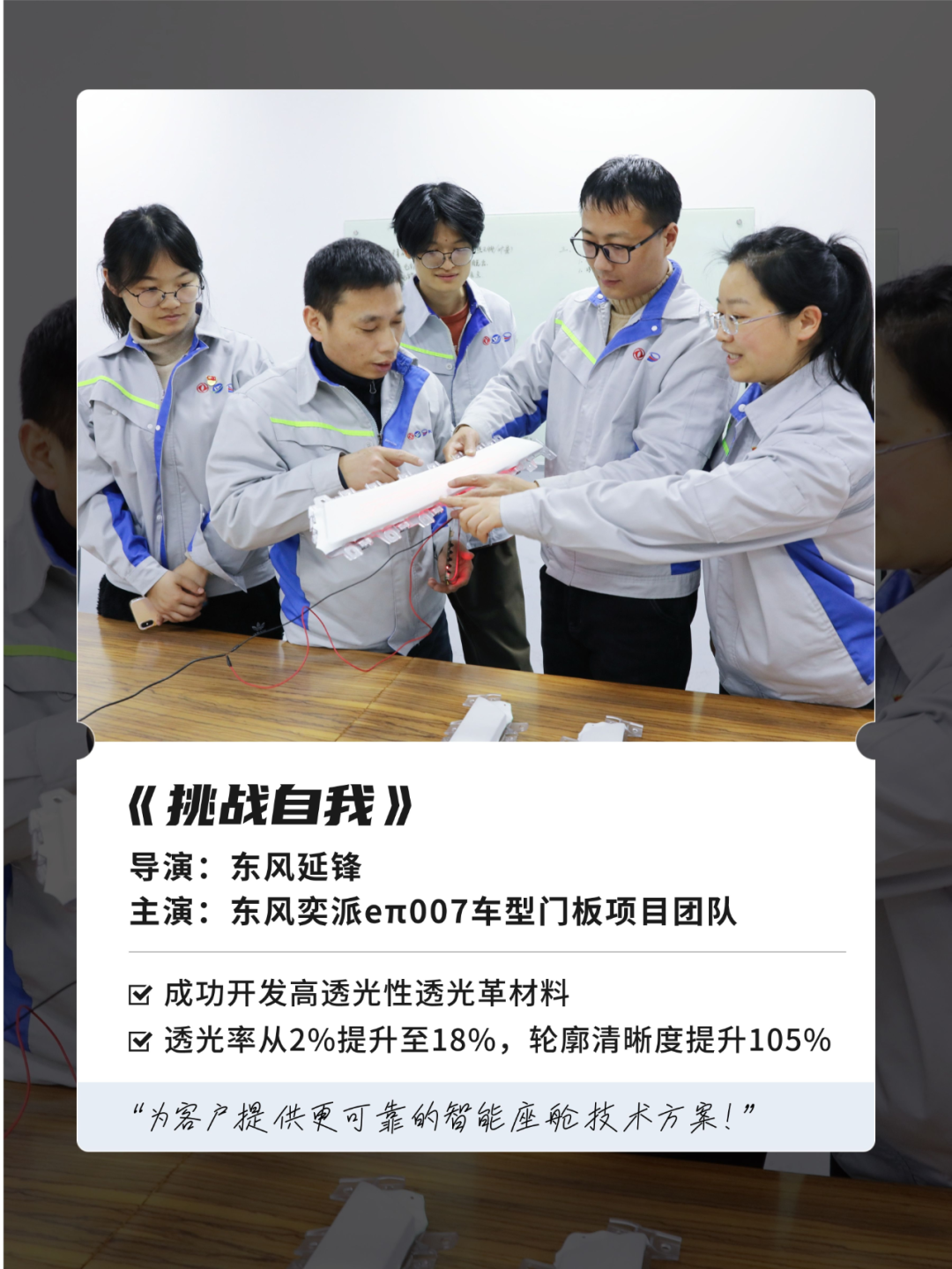 这背后,离不开东风延锋项目团队的不懈努力。“为了带来领先的驾驶体验,东风奕派eπ007采用了带光电显示功能的软质智能表面装饰,为此我们专门开发出高透光性透光革材料,实现了高质量、高精度的图案层设计、布置与生产。”团队成员介绍。