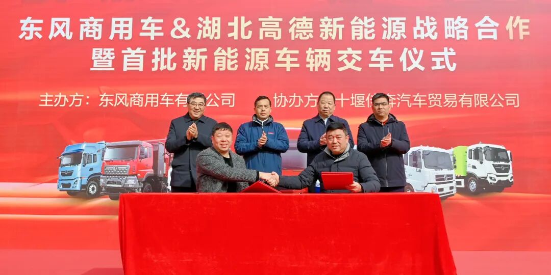 1月23日,东风商用车有限公司与湖北高德新能源有限公司战略合作暨首批新能源车辆交付仪式,在十堰市郧阳区东风汽车商城举行。双方进行100辆东风天龙KC纯电工程车签约并交付首批5辆,以深化合作打响郧阳区新能源“第一枪”,共绘绿色生态新蓝图。