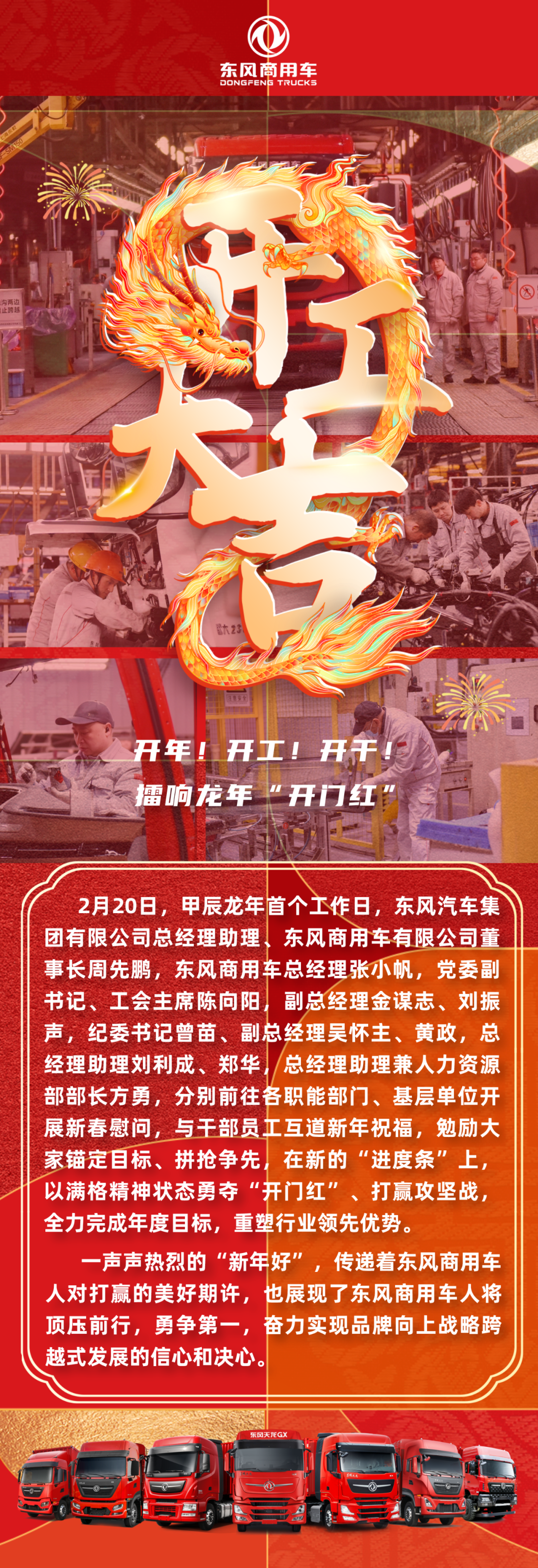 黄政、郑华一行先后来到市场与营销领域、东风商用车新疆有限公司、东风专用汽车有限公司,走进生产车间,了解节后开工情况,并鼓励大家在新的一年加快转型升级,加速研发创新,加大市场开拓,确保全年各项目标任务如期完成。