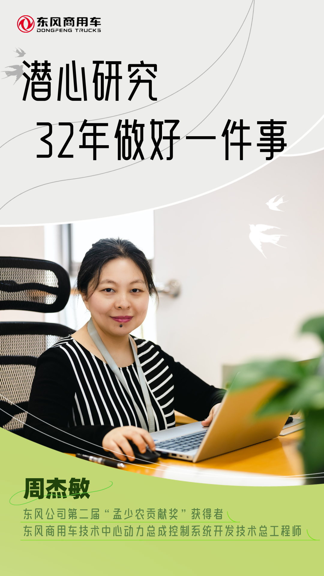 专注自主研发,32年如一日。周杰敏说,未来,我将带领团队继续提升、完善发动机自主控制技术,推动东风商用车动力总成事业向前再走一步。