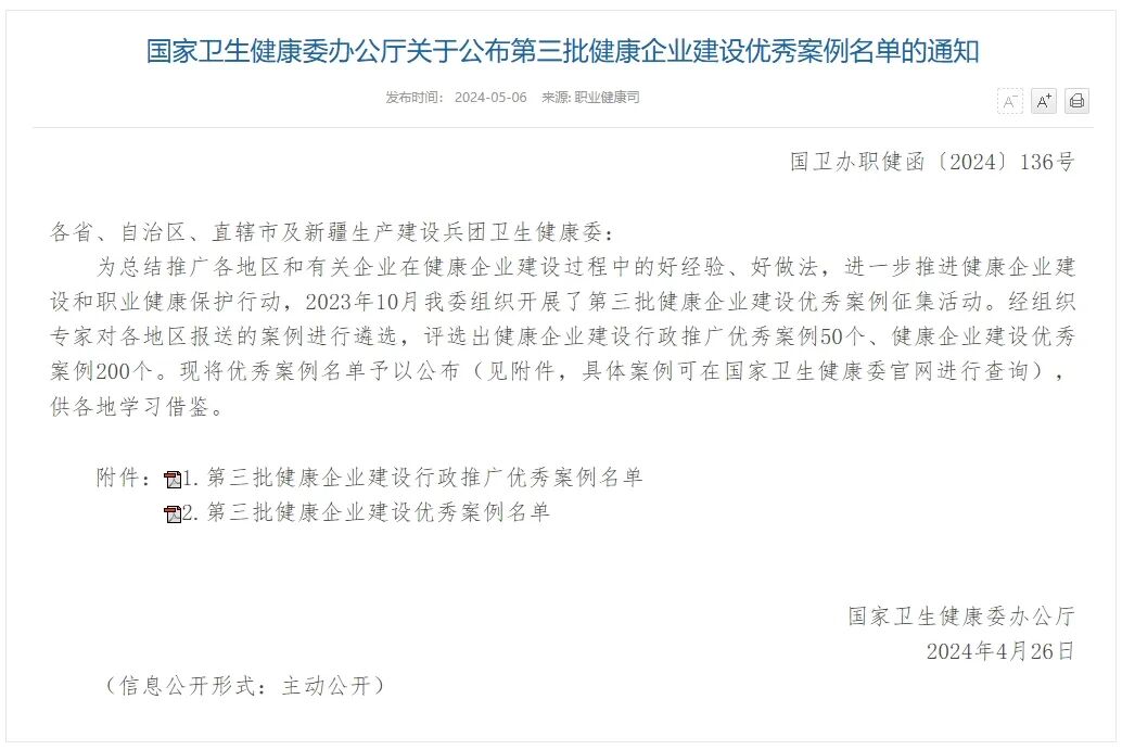 入选第三批健康企业建设优秀案例