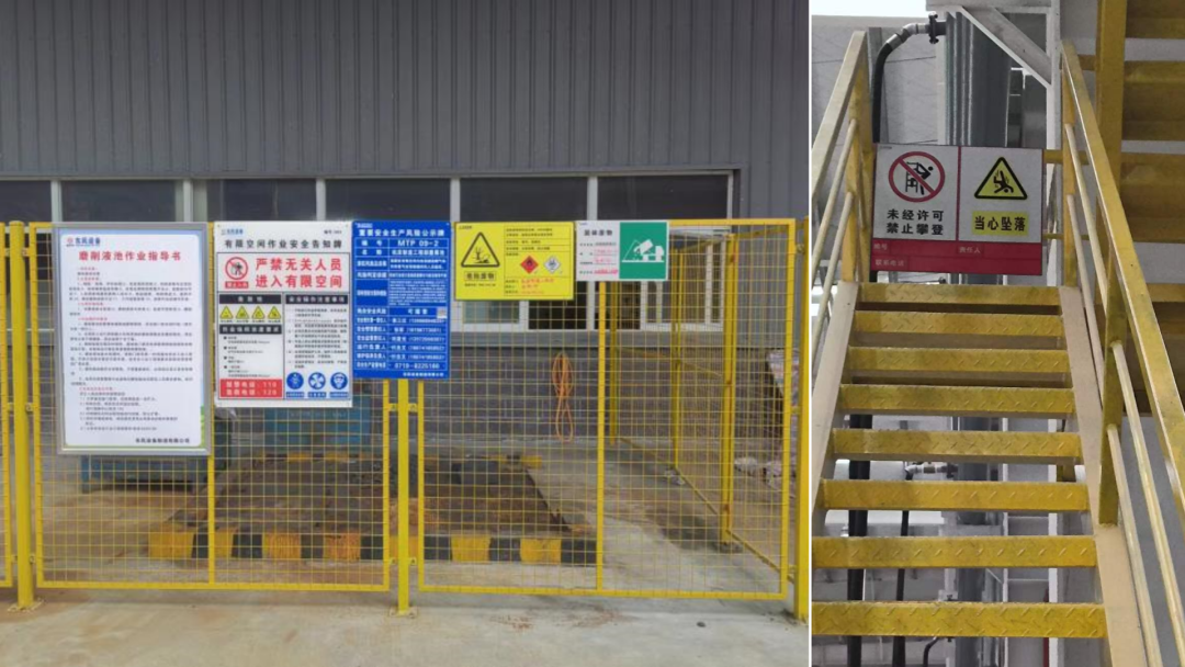 在东风设备制造有限公司的生产现场、厂区道路及危险作业区域,673个安全警示标识、477个环境保护标识、8个有限空间作业告知牌醒目清晰,对员工进行全方位提示,不断增强员工安全环保意识。