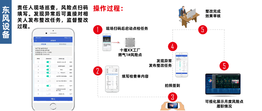 推进信息化建设,东风科技积极构建安全环保监管新模式,建立重点隐患部位点检一览表,实现重要风险部位的扫码履职及检核功能,有效提升安全管理实效。