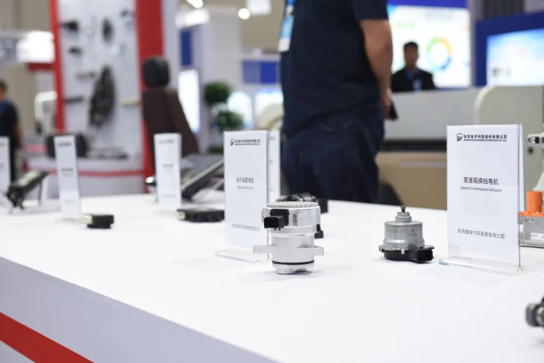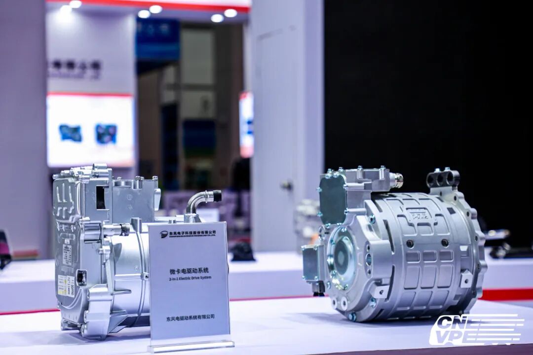 展示东风科技新能源电池部件和动力总成技术系统,包括微卡电驱动系统、电机空心轴、专为纯电和增程式新能源乘用车设计的减速器。