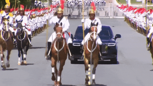 在120名龙骑兵护卫下,习近平主席乘车抵达黎明宫前广场。卢拉总统和夫人罗桑热拉热情迎接习近平主席,并为习近平主席举行隆重盛大欢迎仪式。