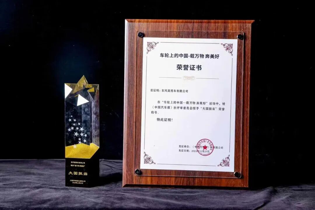 11月26日,由中国汽车报主办的“2024车轮上的中国——载万物 奔美好”主题活动在北京举行,活动盘点并表彰了2024年度对行业具有杰出贡献的品牌及产品,共绘美好交通新未来。东风商用车有限公司获得“大国担当”荣誉称号。