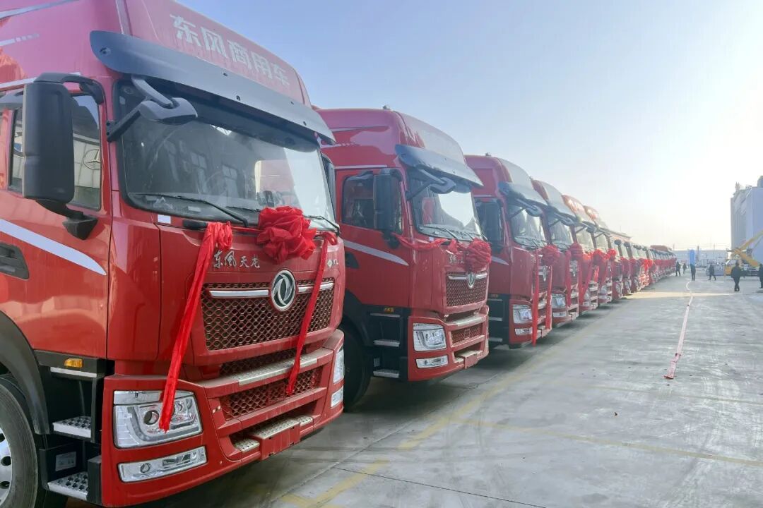 在新疆哈密,东风商用车向区域大客户交付62辆东风天龙KL龙擎3.0燃气车(母车)+东风天龙VL龙擎3.0燃气车(子车),为疆煤外运增添新动力。