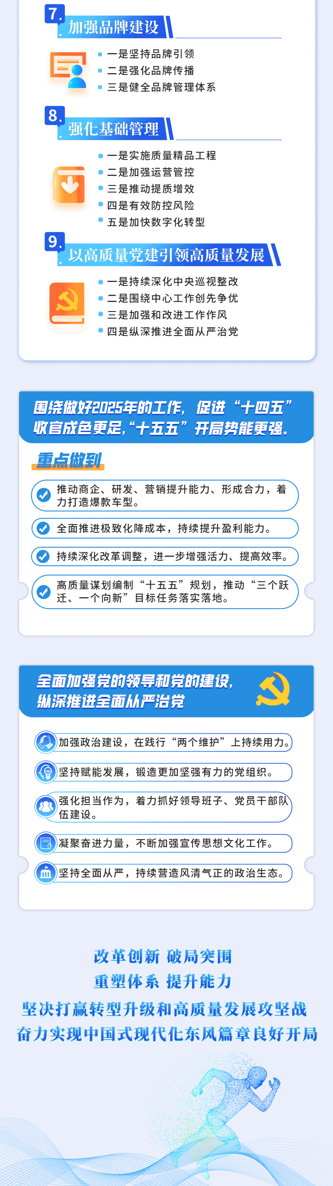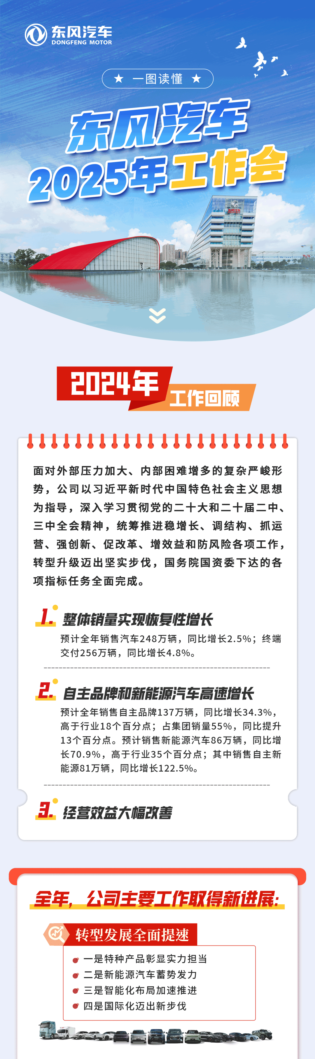 本次会议采用视频连线的形式召开,在东风汽车总部设主会场,在各基地设分会场。东风汽车董事长、党委书记杨青作题为《铆足干劲攻坚克难 凝心聚力向新跃迁 奋力实现中国式现代化东风篇章良好开局》的讲话。东风汽车总经理、党委副书记周治平作题为《改革创新 破局突围 重塑体系 提升能力 坚决打赢转型升级和高质量发展攻坚战》的报告。东风汽车副总经理、党委常委张祖同主持会议,并传达中央经济工作会议、中央企业领导班子思想政治建设座谈会和中央企业负责人会议主要精神。