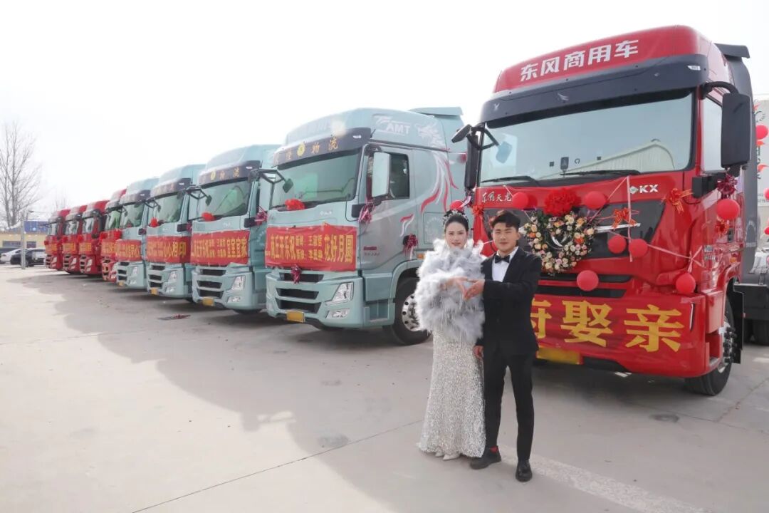 ▌新人脸上洋溢着幸福笑容,10辆东风天龙KX燃气车作为“气氛组”在他们身后,成为婚礼中的独特风景