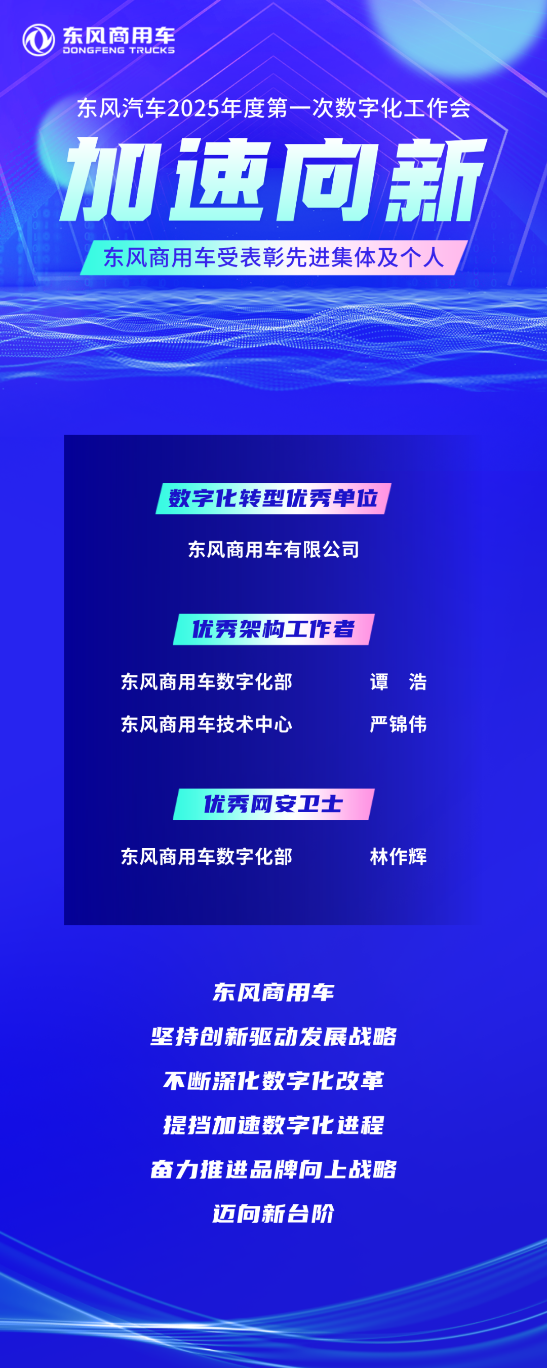 在东风商用车数字化部的精心组织和稳步推进下,东风商用车在东风汽车开展的数字化转型行动成熟度评价中达到了L3级水平,成功入选国资委首批数字化转型试点企业,标志着东风商用车在技术创新、流程优化和管理提升等方面取得了突出成效,为东风汽车及行业的数字化转型贡献了宝贵经验。