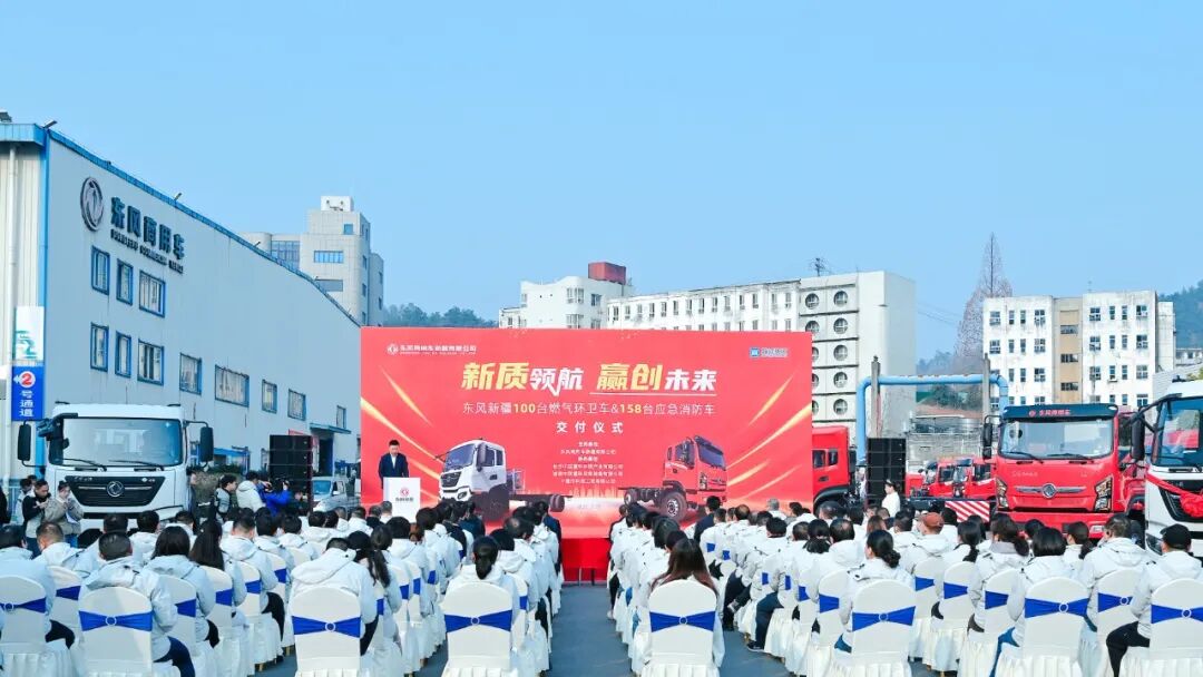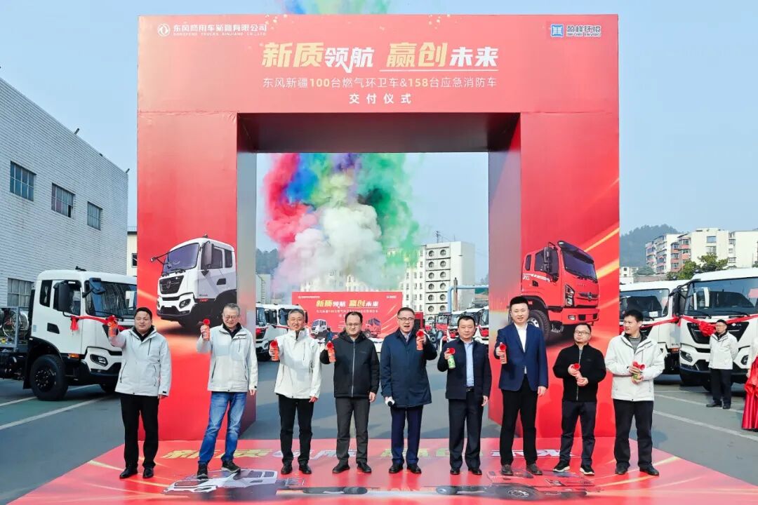 新质领航,赢创未来。东风商用车新疆有限公司100辆燃气环卫车&158辆应急消防车交付仪式在十堰举行。其中100辆燃气环卫车交付长沙中联重科环境产业有限公司(以下简称“中联环境”),158辆应急消防车交付湖南中联重科应急装备有限公司(以下简称“中联重科应急装备”)。标志着东风商用车与中联环境、中联重科应急装备战略合作更进一步,在专用车领域携手并进,以绿色科技共同守护美好城市建设、社会安全稳定。