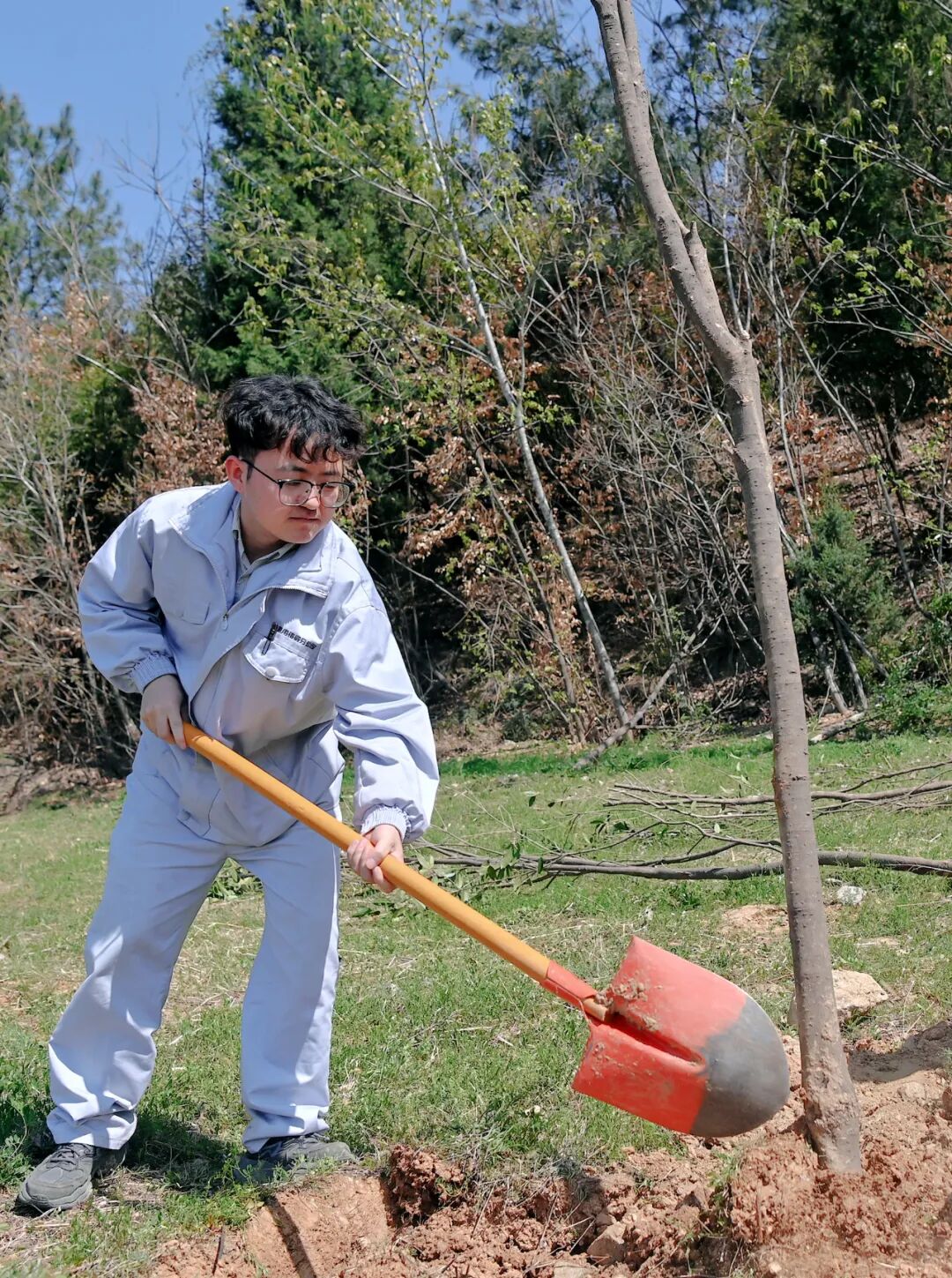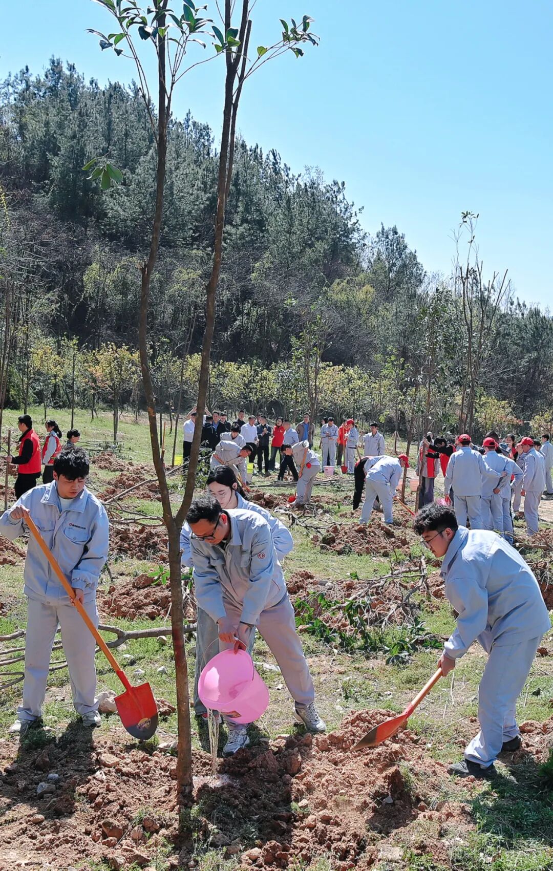 一起挥锹铲土、扶正树苗