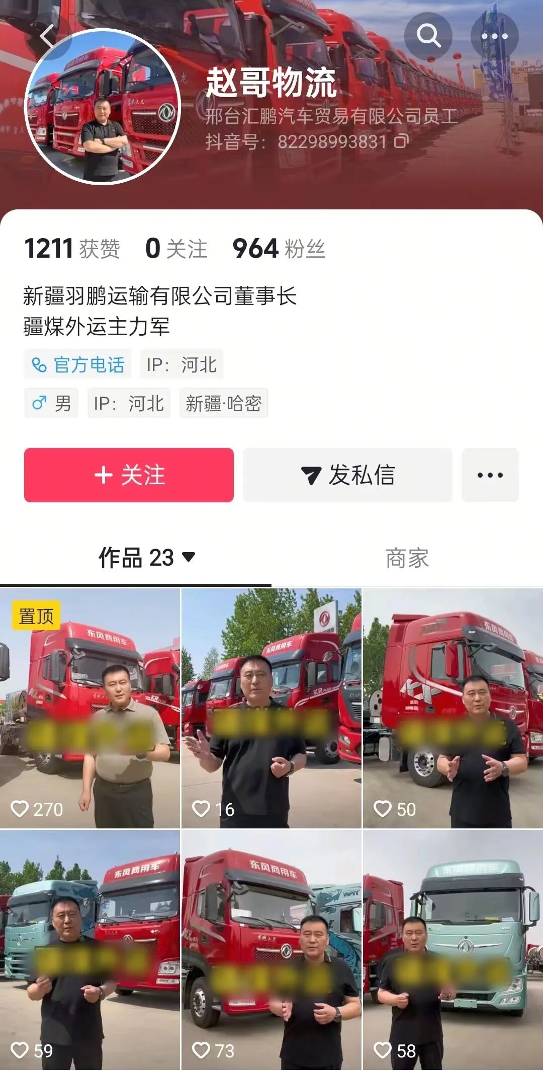 “卡友兄弟,如果您在选车、购车、物流配货方面有什么困扰,需要帮忙的,尽管来找赵哥。”东风商用车邢台汇鹏4S店董事长赵安民在个人抖音号“赵哥物流”上为卡友排忧解难。