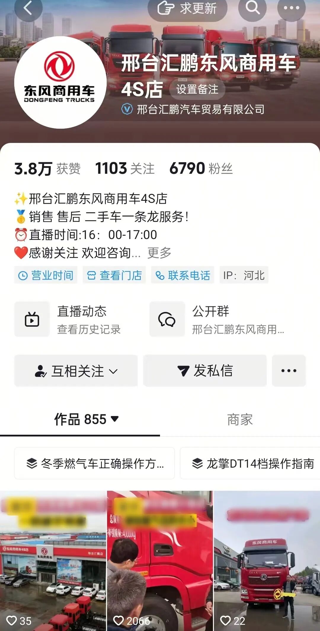 2025新年伊始,“邢台汇鹏东风商用车4S店”抖音号便忙碌了起来,每天都有专人进行直播销售,让更多驾驶员、客户以及物流公司能够第一时间掌握最新优惠政策。