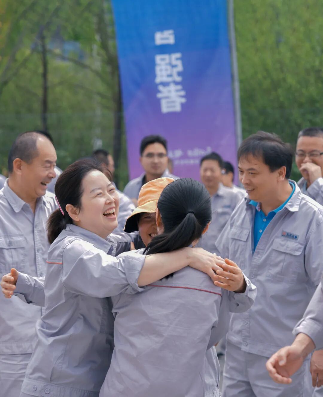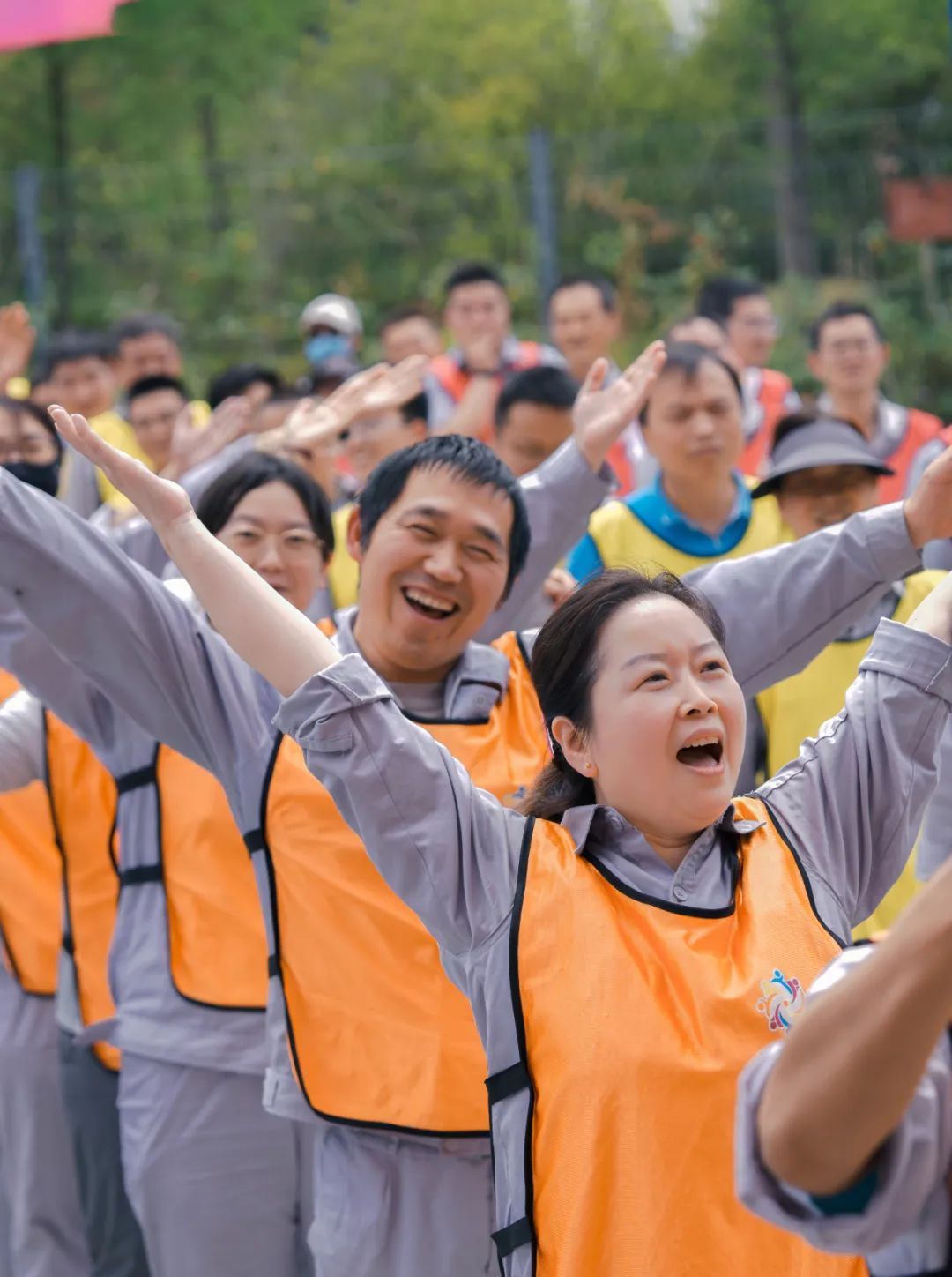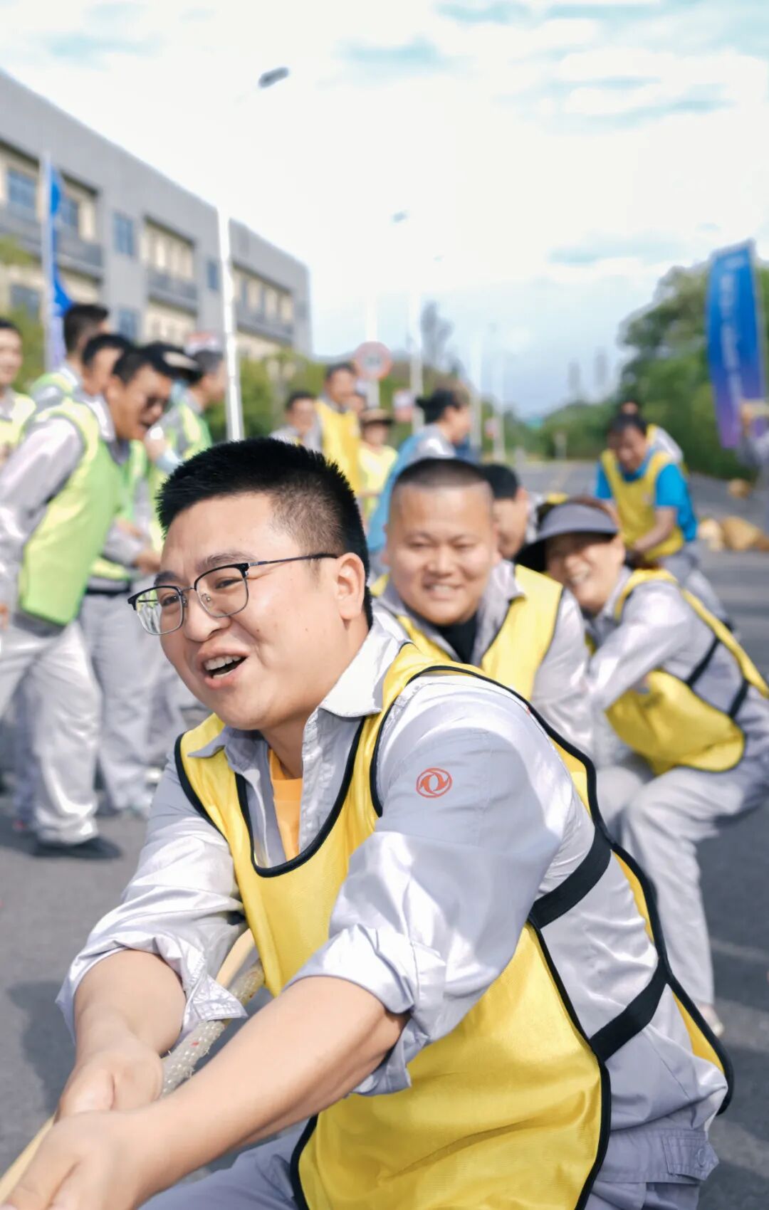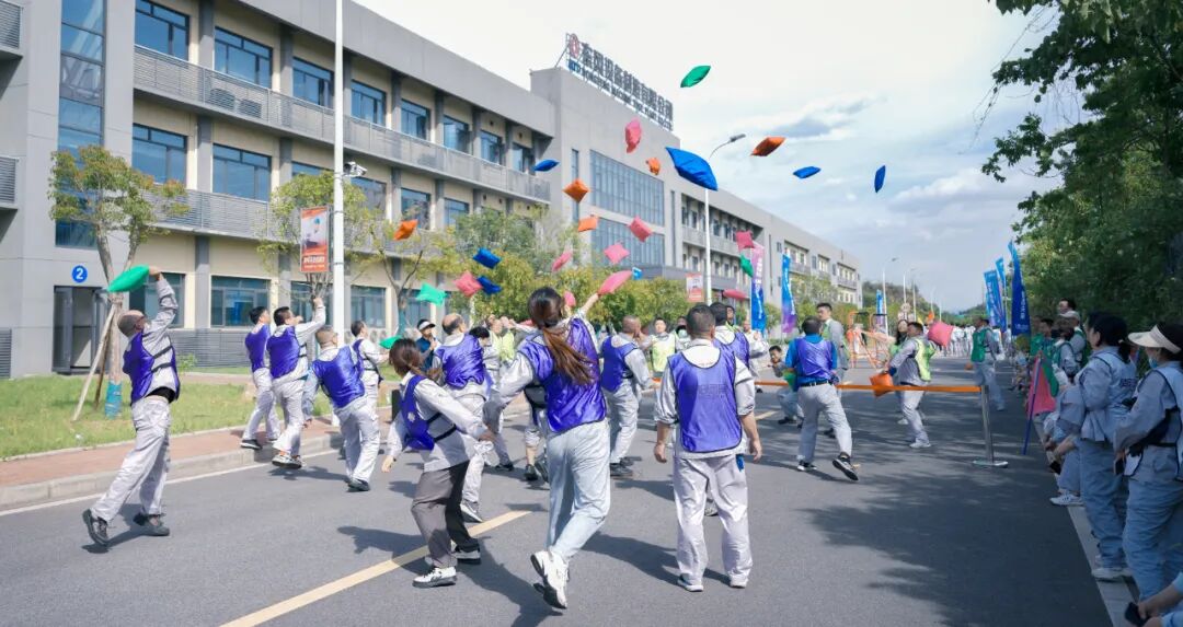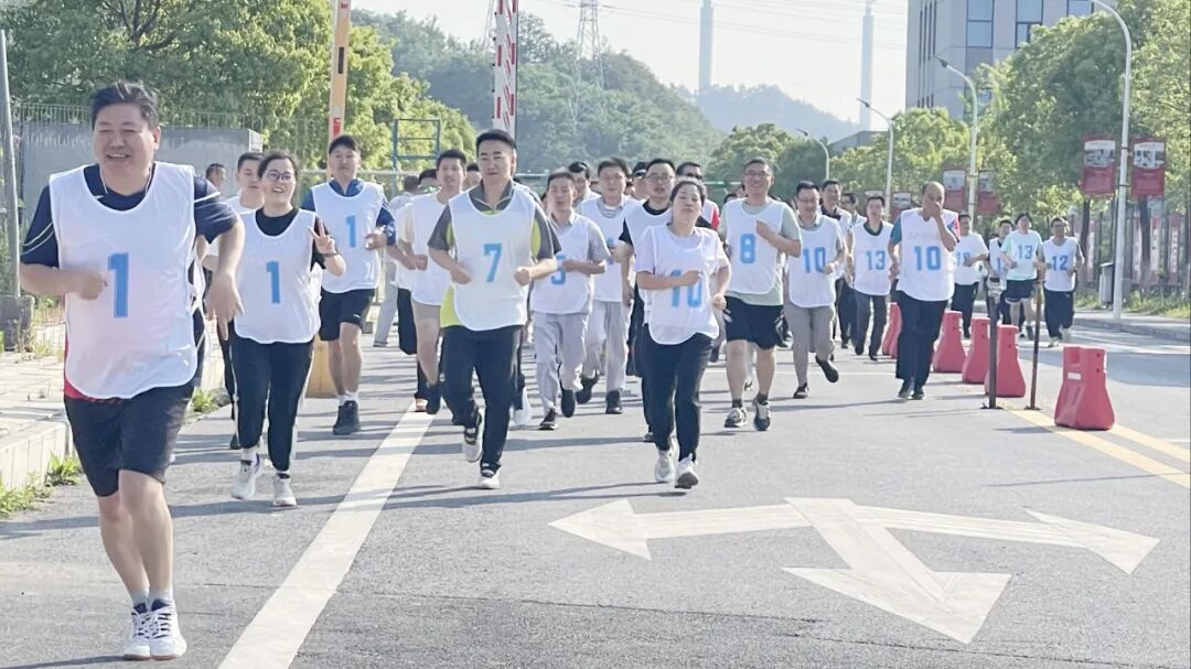 时值初夏,工业园里鸟语花香、景色怡人,员工们快速行进,你追我赶,互相鼓励,携手冲过终点。