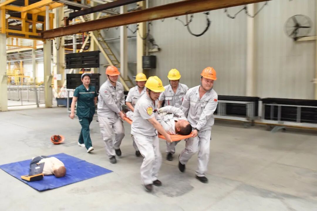 公司副总经理黄政出席活动。“有员工被工件砸到了!”“现场立即断电、停止一切作业,看护好伤者,立即拨打120并报告健康小屋紧急救援。”从启动预案到救援队伍实施救援,再到伤员急救与转运,整个演练过程充分展现了应急救援团队的高效协作和专业技能。
