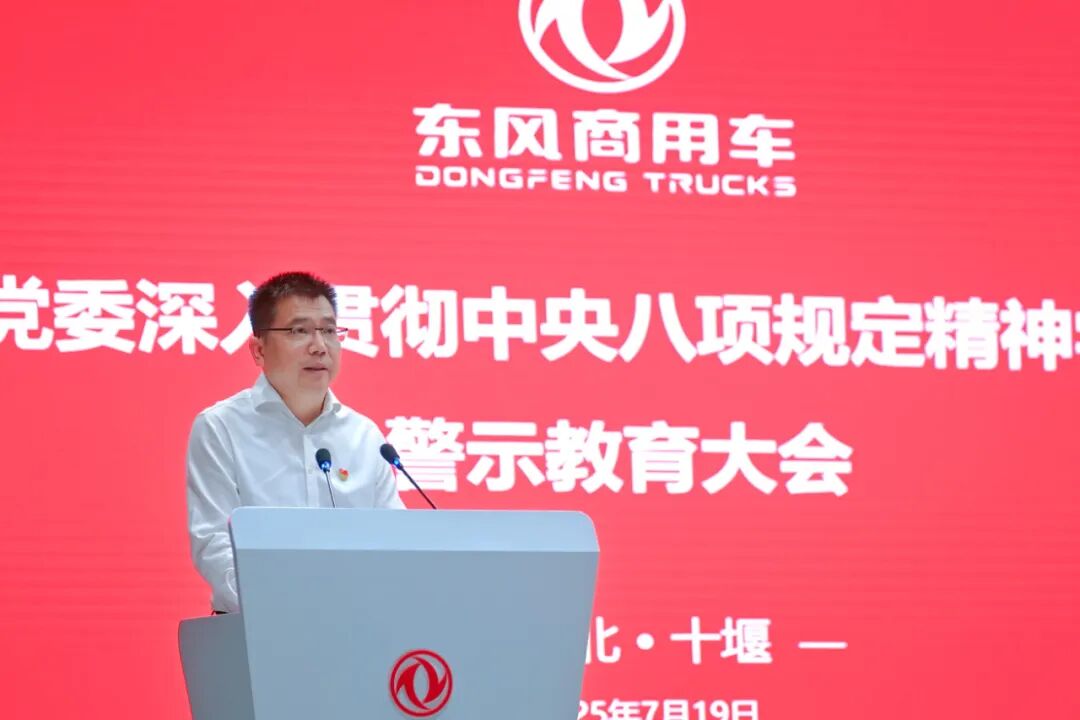 7月19日,东风商用车党委深入贯彻中央八项规定精神学习教育警示教育大会举行。会议深入学习贯彻习近平总书记关于加强党的作风建设的重要论述精神,落实东风汽车党委警示教育大会工作要求,通报、剖析典型案例,教育引导党员干部进一步筑牢遵规守纪的思想堤坝,持续推动学习教育走深走实,纵深推进全面从严治党,为公司打赢扭亏为盈攻坚战和高质量发展提供坚强保障。